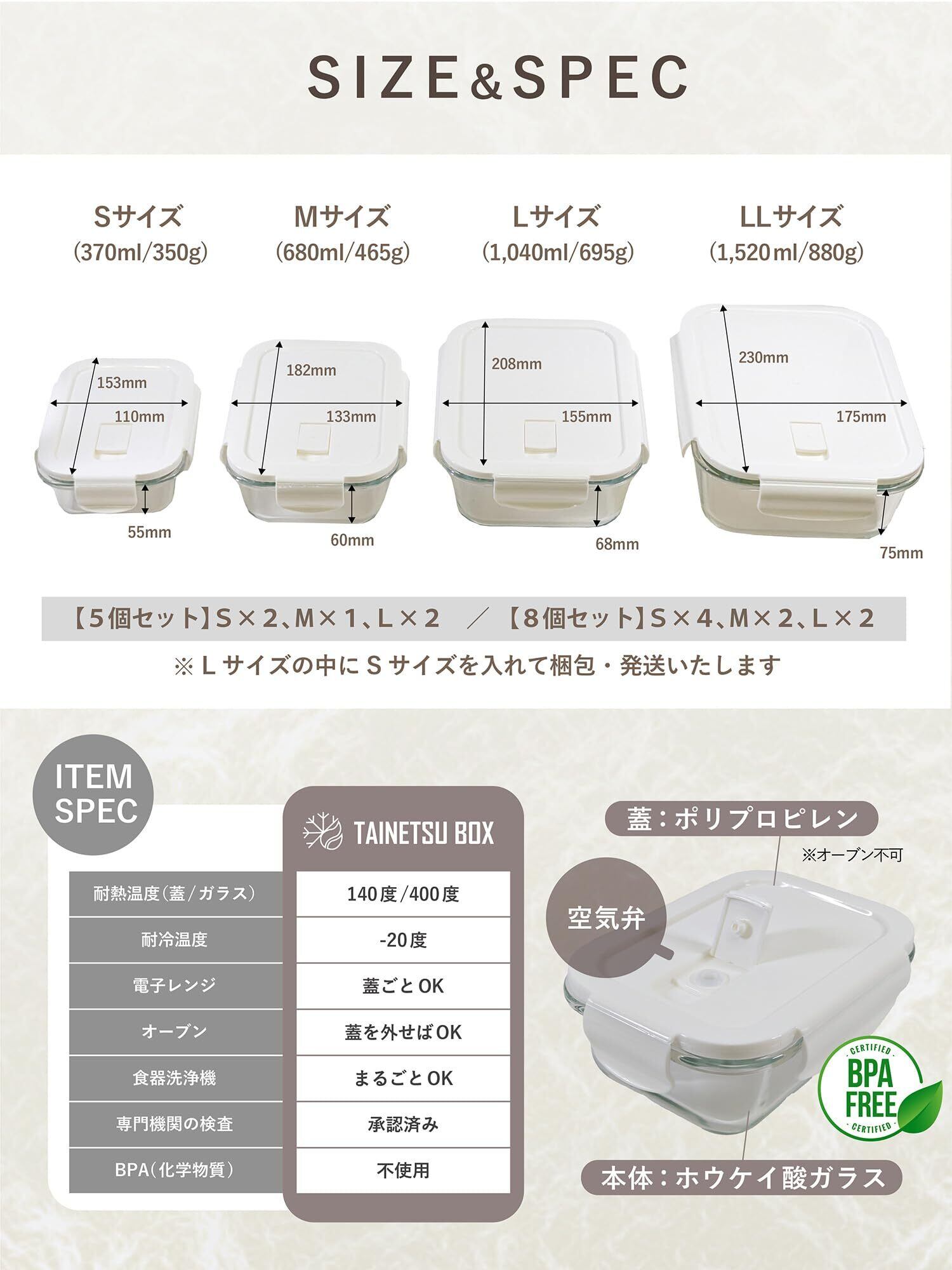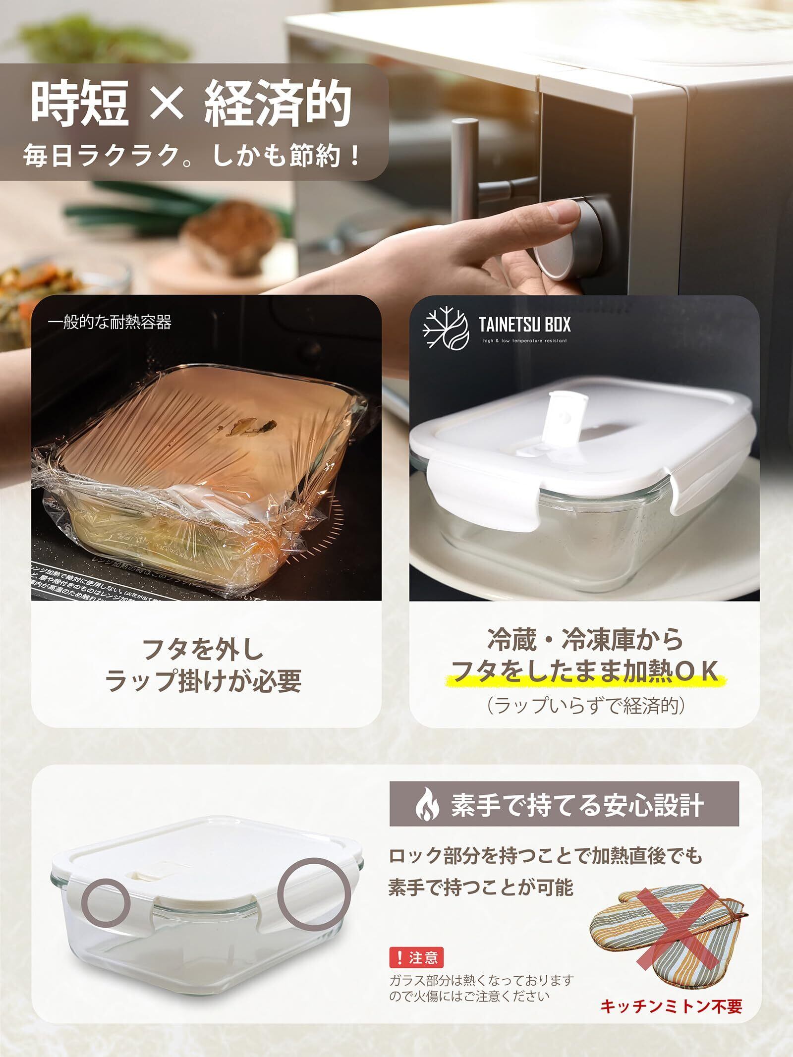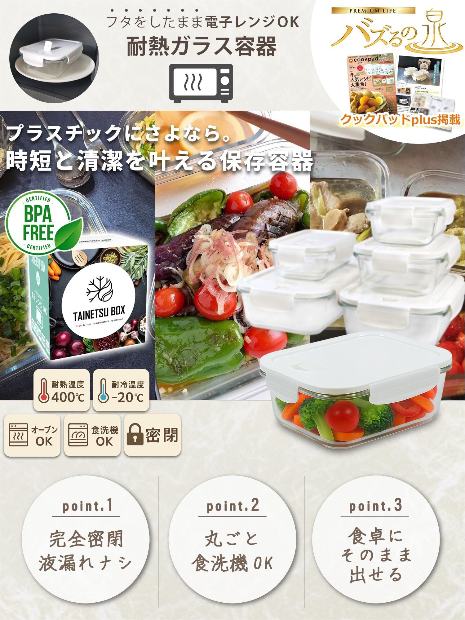 【ご注意】●電子レンジを使用する際は、破損の原因となりますので必ず空気弁を開けた状態で加熱してください。●オーブントースター(オーブンレンジのオーブンメニュー)は140以上の高温となる為、加熱時は必ずフタを外した状態でご使用ください。(ガラス容器のみ可能) ■加熱後にロックをしたまま冷ます場合は、空気弁を開けた状態で放置してください。閉めたまま放置するとフタが凹み破損の原因となります。 ●熱くなった状態のものを急激に冷やすと、ガラスが破損する可能性がありますのでご注意下さい。●水や水分量の多い食材は冷凍保存に適しておりません。水は凍らせることで体積が増す為、ガラス容器の破損の原因となります。お米は見た目以上に水分量が多く膨張率が高い為、破損する可能性が高い食材となります。冷凍保存はお控えください。