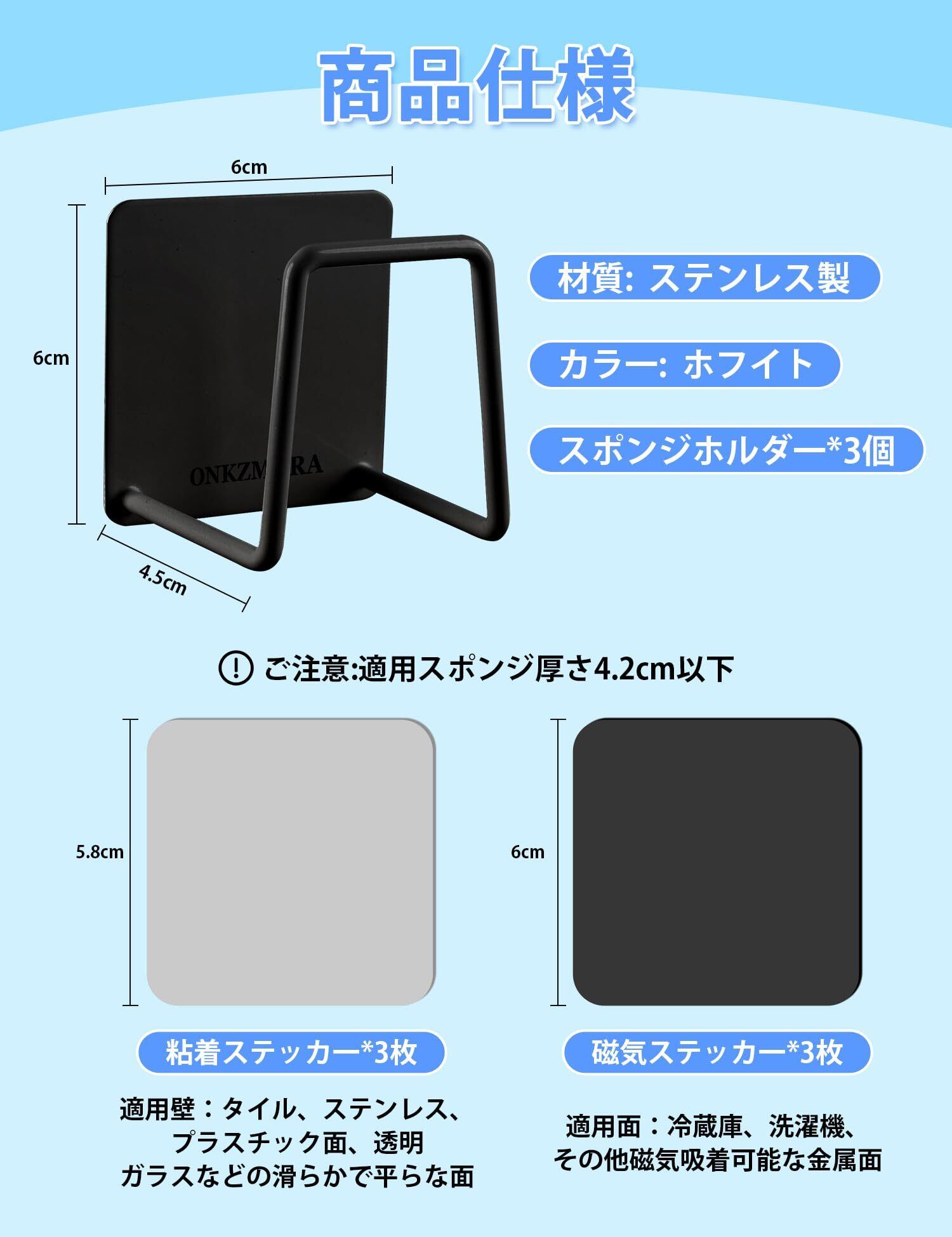 【商品仕様】サイズ:6×6×4.5cm、適用スポンジ厚さ:4cm以下、パッケージ内容:スポンジホルダー×3個、粘着ステッカー×3枚、磁気ステッカー×3枚。※ご注意: 設置後24時間放置してからご使用ください。浮かせるスポンジホルダーには軽いアイテムしか収納できません。