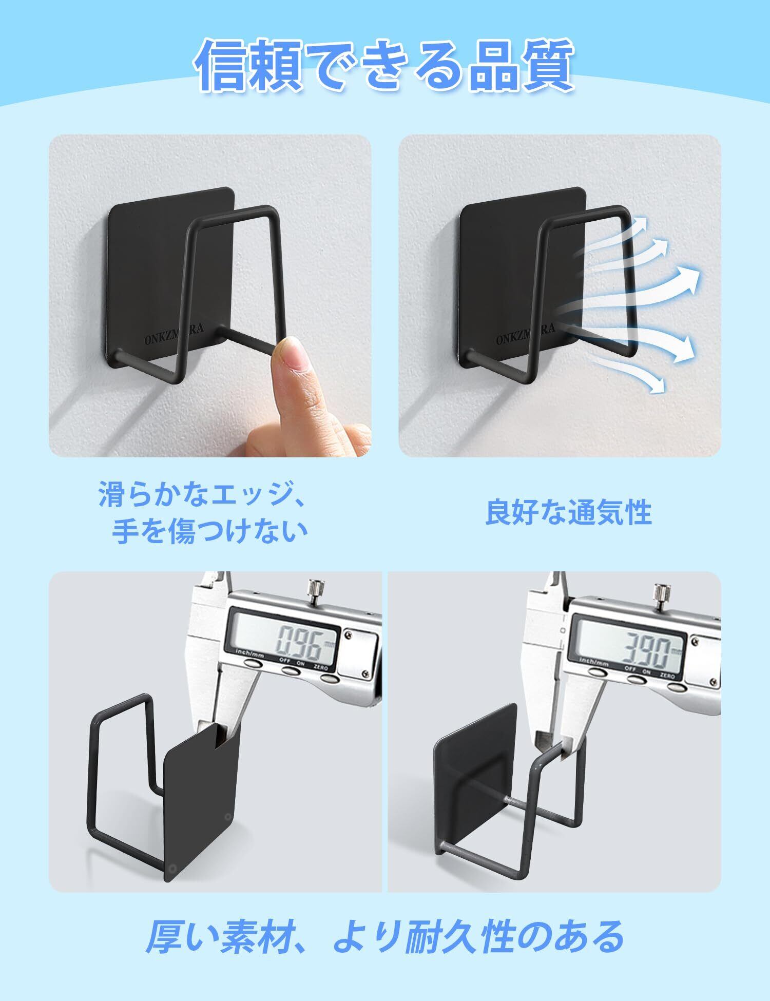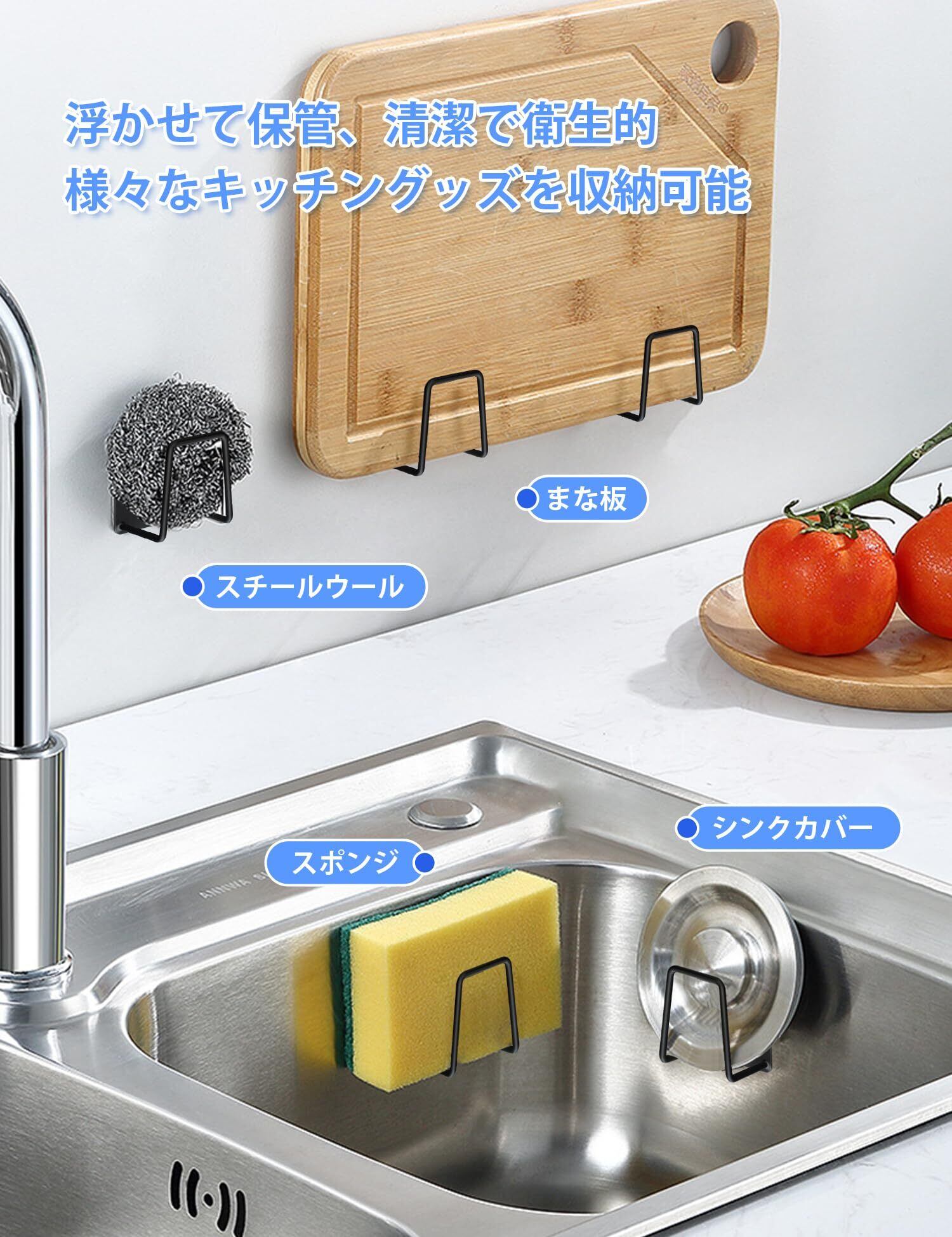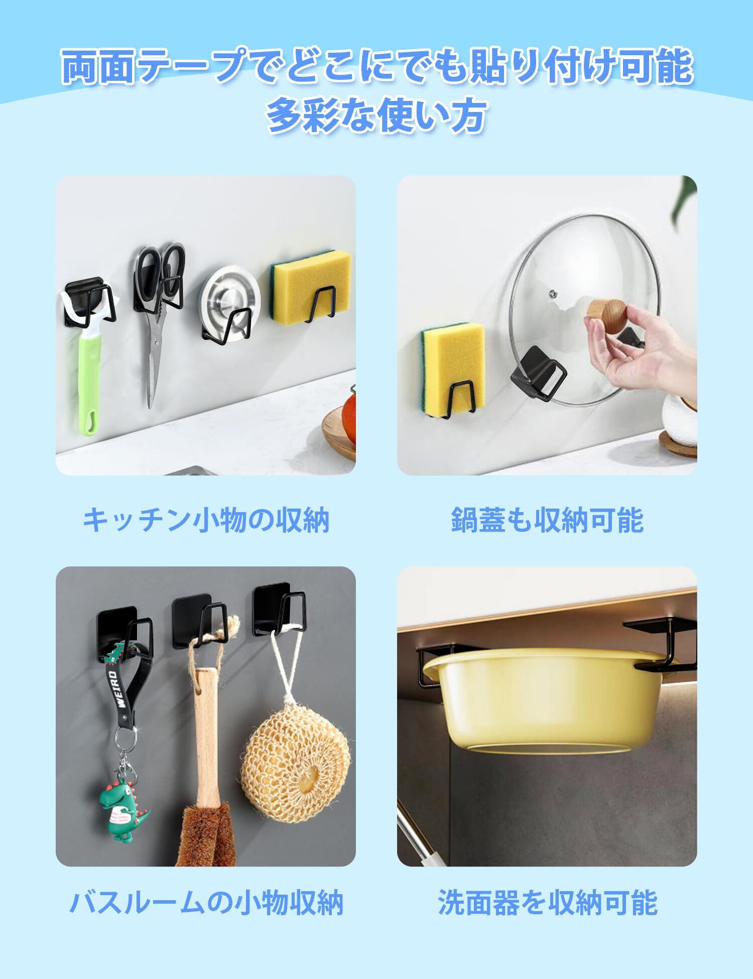 【幅広い用途に対応】スポンジの収納だけでなく、ラップを置いたり、軽いものを吊るしたりするのにも使えます。キッチンの壁、冷蔵庫、バスルームの壁面、洗濯機などに貼り付けることができます。