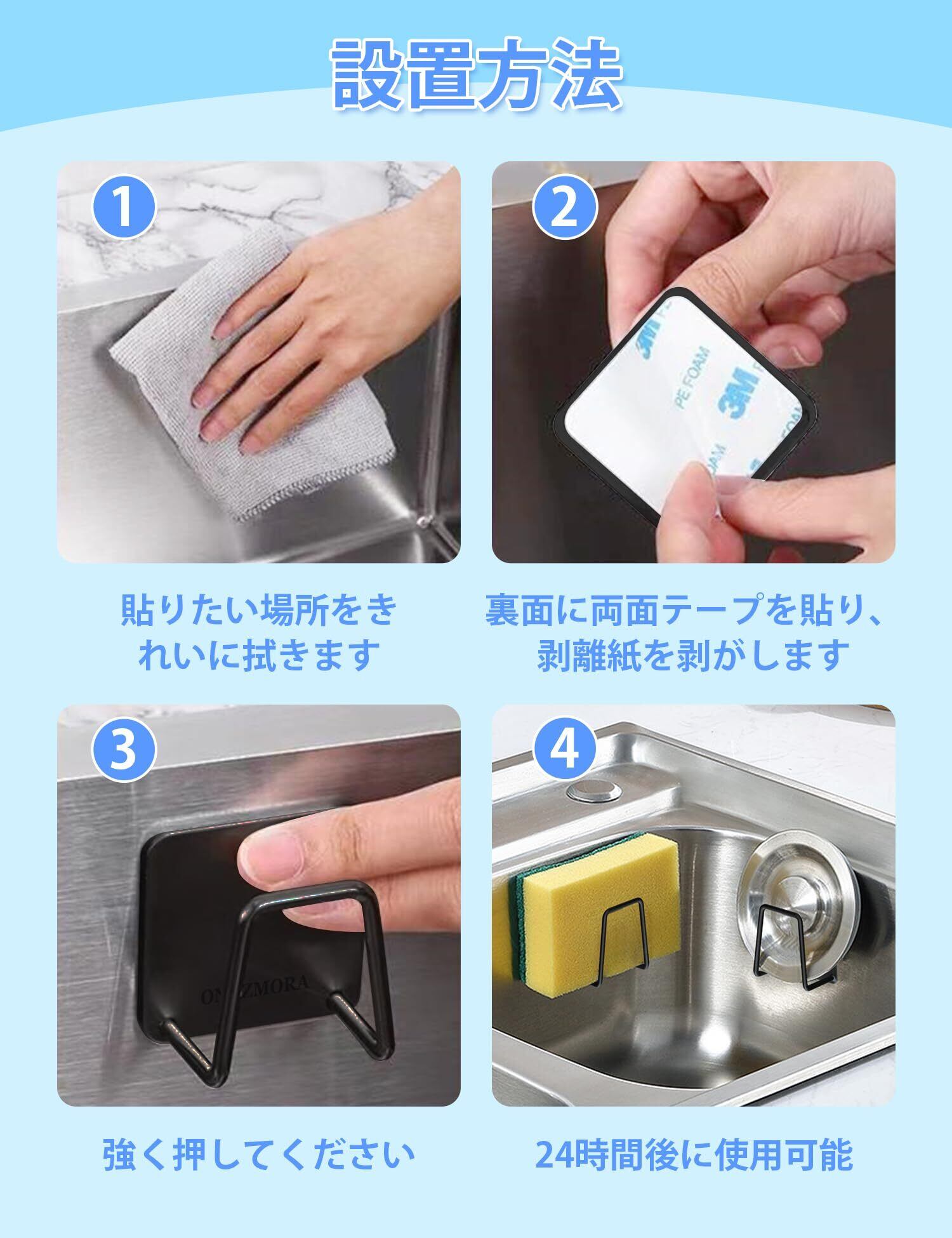 【2つの取り付け方法】1.強力なマグネットステッカーが付属していますので、ご使用の際は、マグネットの粘着面の剥離紙を剥がしてから、スポンジホルダーにマグネットを貼り付けてください。冷蔵庫や洗濯機などの磁気面に貼り付けることができ、必要に応じて自由に移動できます。2.強力両面テープ付きなので、キッチンや浴室など様々な場所に貼れます。コンパクトサイズなので場所もとりません。