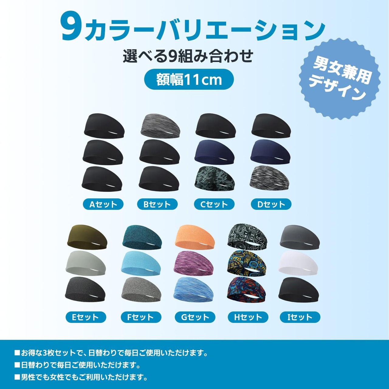 ヘアバンド メンズ 額幅11cm ヘッドバンド 汗止め スポーツ 幅広 薄型 バンダナ ヘアターバン ワイド 男女兼用 3枚セット Aセット