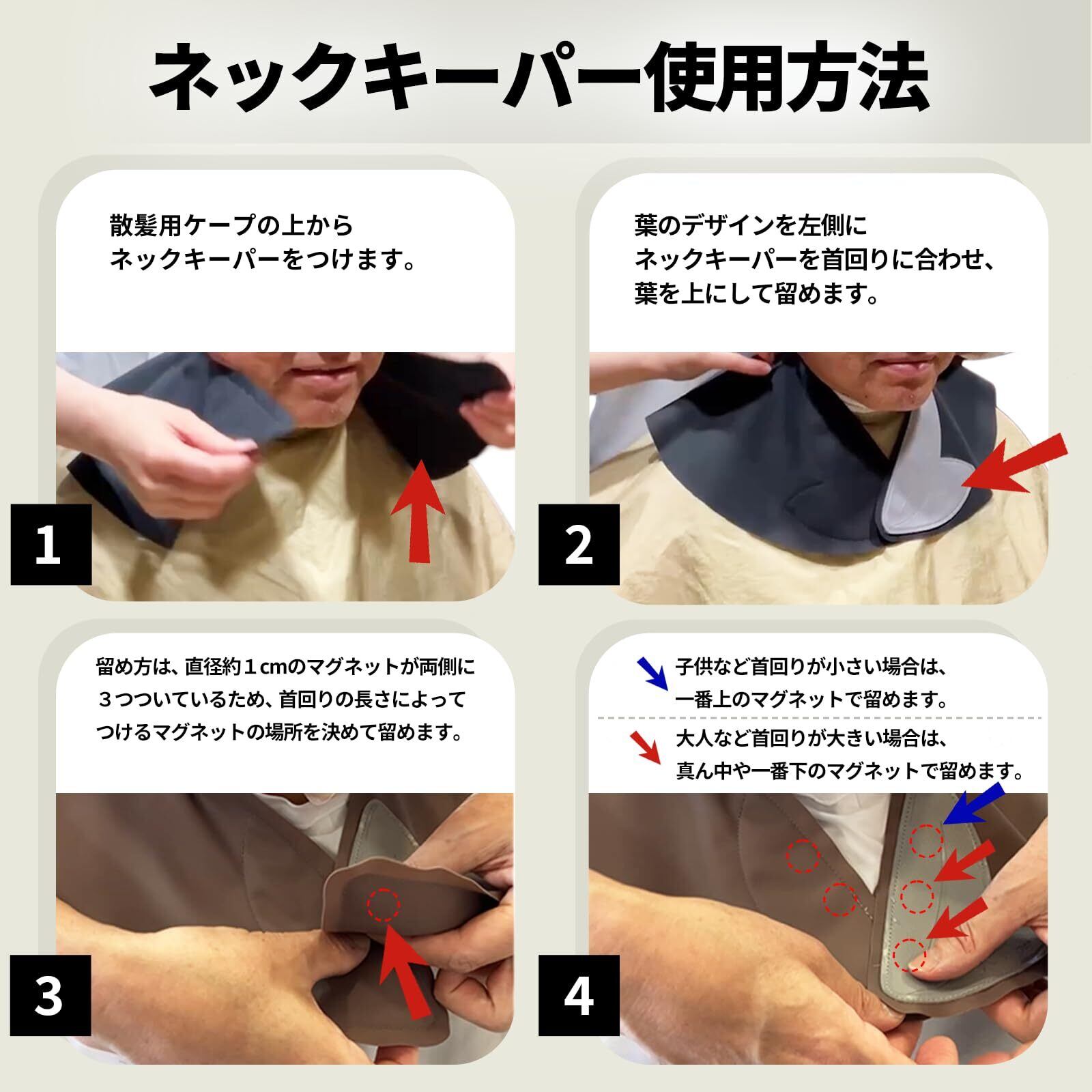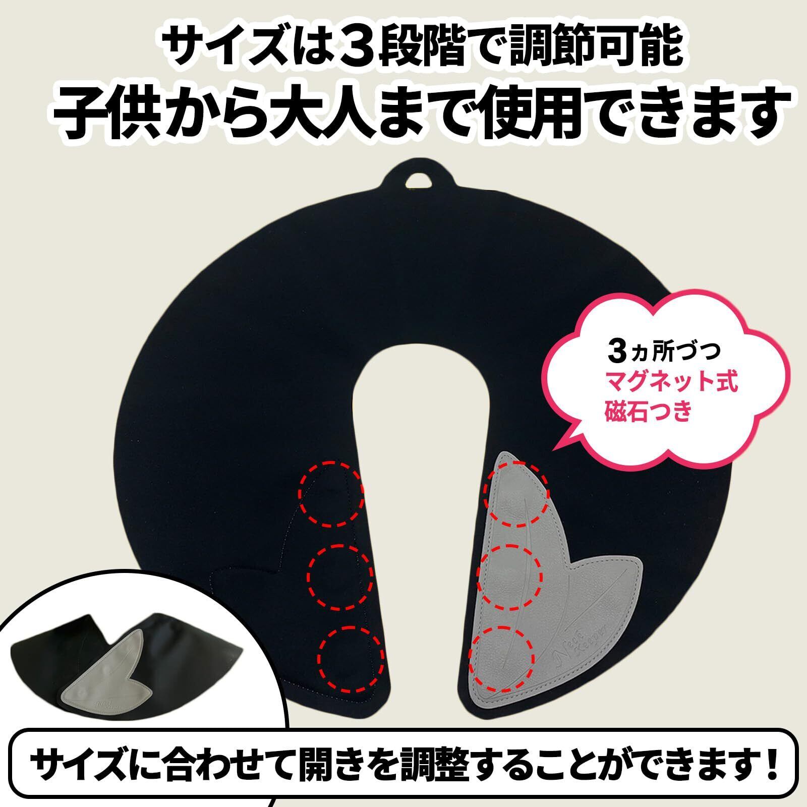 マグネット式のため、簡単に装着できます。直径約1cmのマグネットが片側に3つついているため、つけるマグネットの場所によって首回りの長さを調節できる使用です。マグネット式のため髪の毛も絡みません。