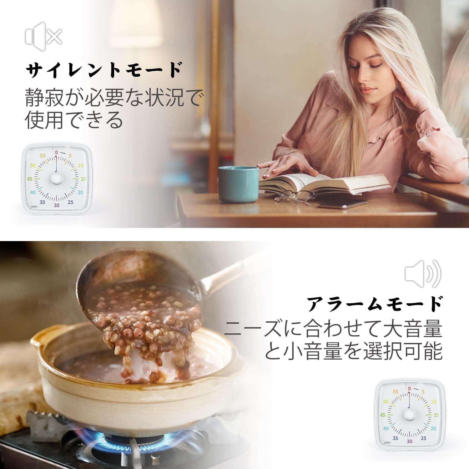 夜間ライト付き消音モード: このアップグレード版タイマーは特別に夜間ライトモードを追加しました。ミュートを選択すると、ナイトライトモードが選択できます。時間が来たら、ナイトライトが点滅します。図書館での勉強やカフェでの仕事など、静かな公共の場に最適です。また、薄暗いときは、上部のライトボタンをタッチして、カウントダウンの時間を見ることができます。