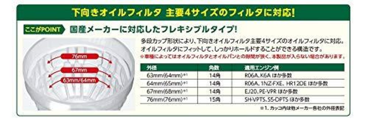 用途:下向きオイルフィルタを緩めた後の取り外し・残留オイルの漏れ受け
