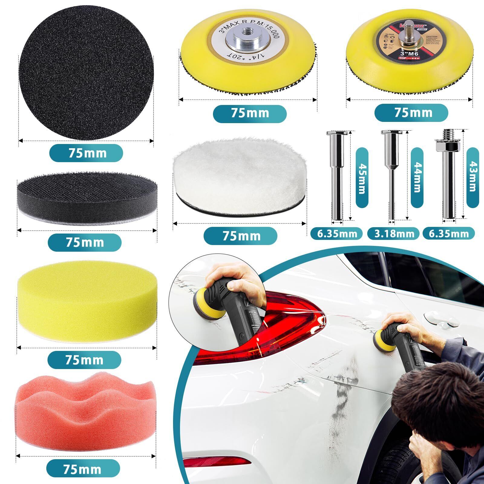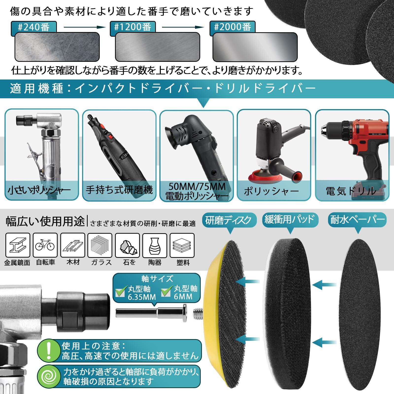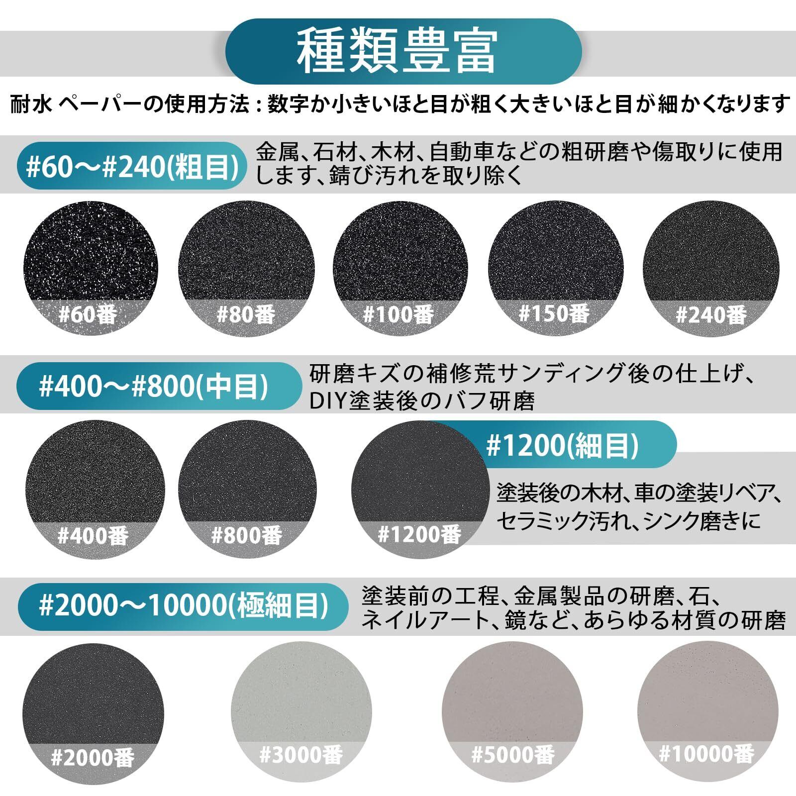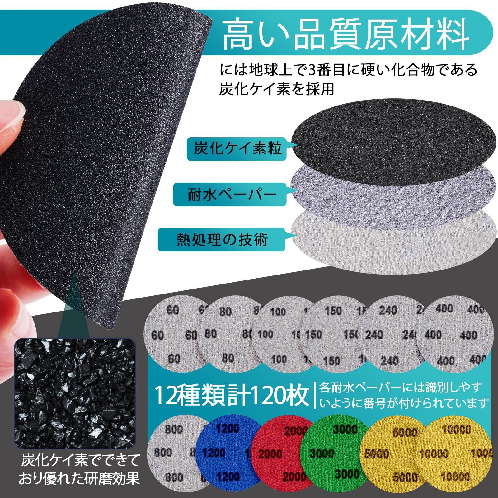 セット内容:120枚 75mm耐水ペーパー 粗目から細目まで: 60 80 100 150 240 400 800 1200 2000 3000 5000 10000番 12種類各10枚。 乾湿両用で使用可能。各サンドペーパーの裏には番号が付いています、小分け袋に入れてお届けしますので。吸着盤2点、 3インチ: ポリッシャーバフ2 枚、ウールパッド 1個、ボルト 轴 4個。