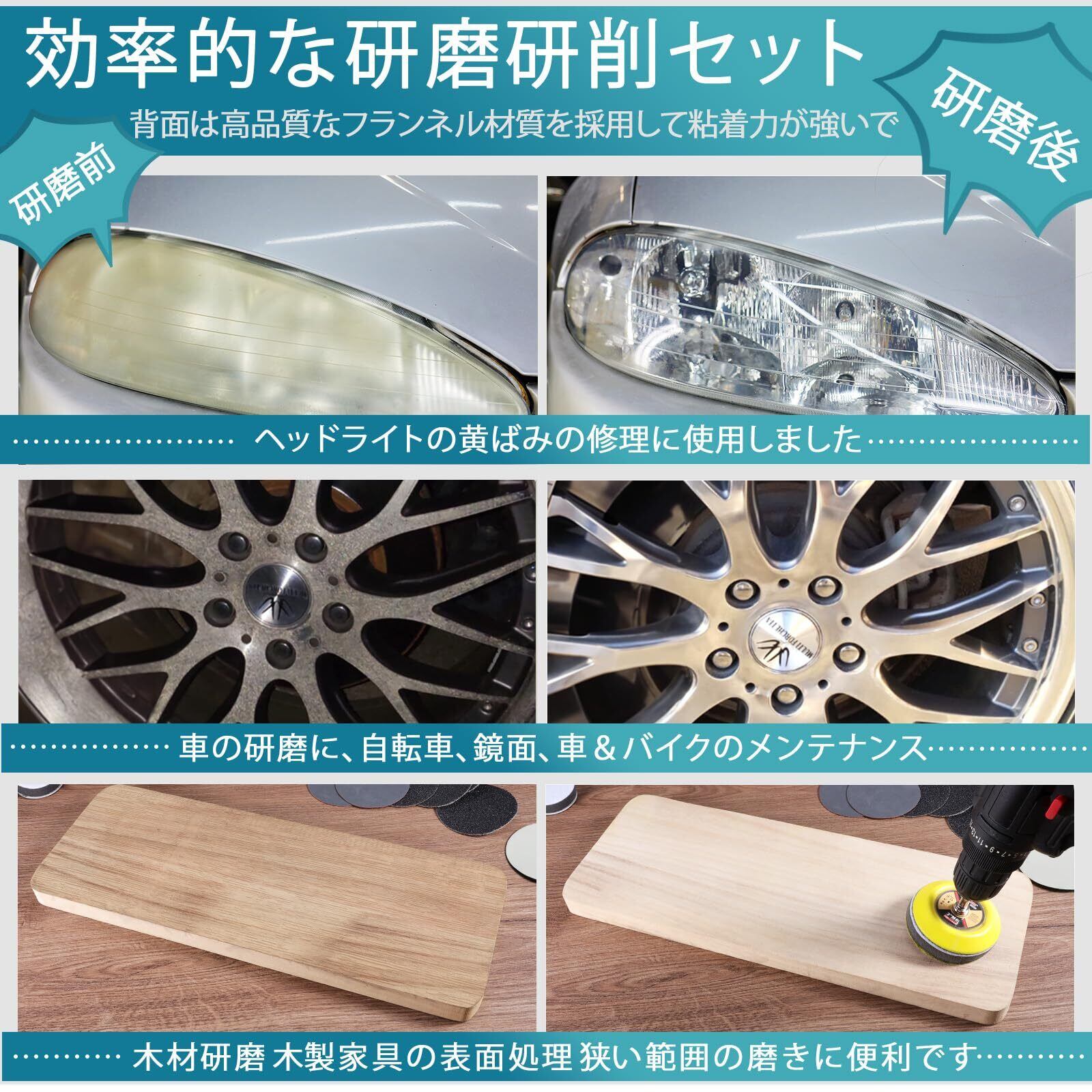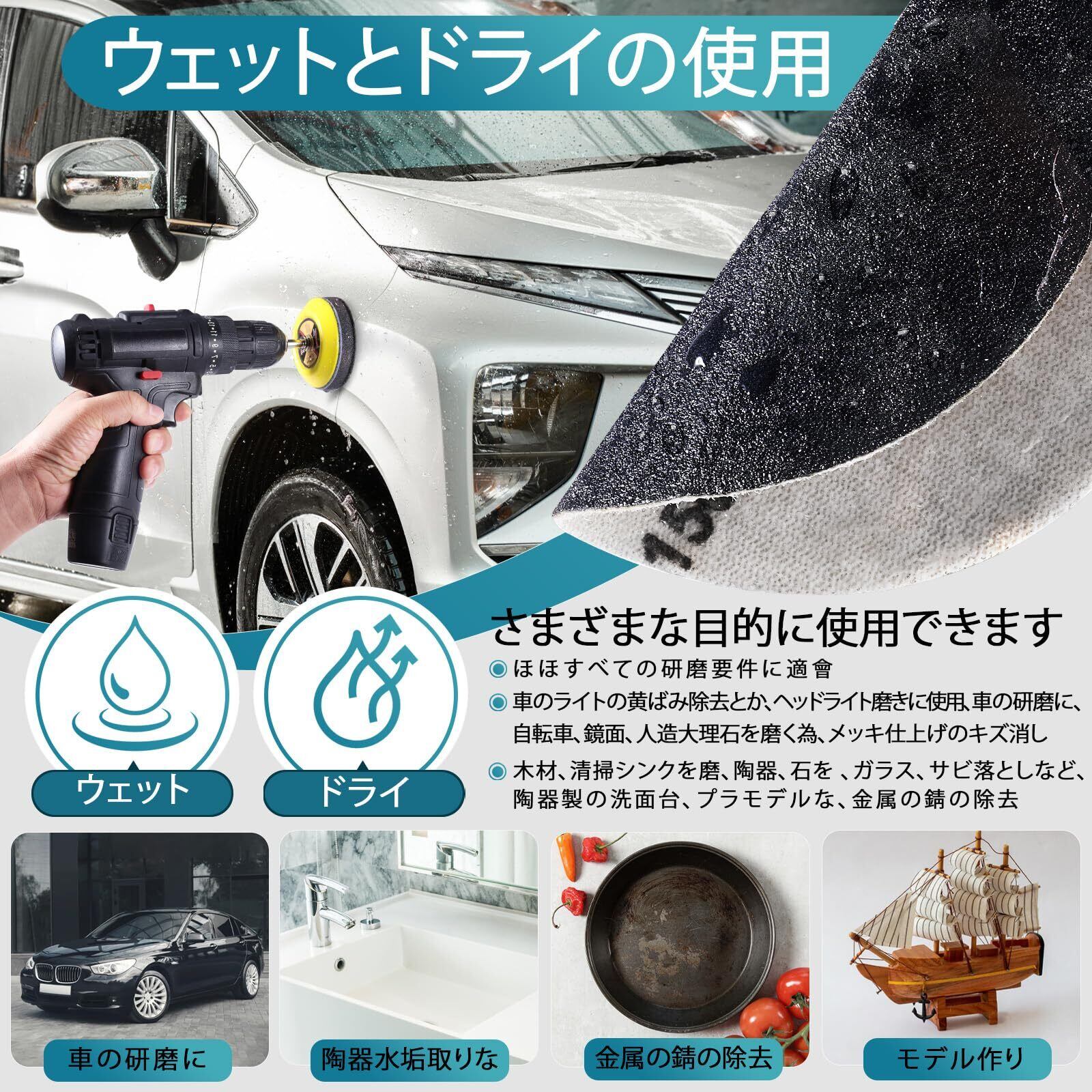 様々な場所に:洗車、金属、木材、水垢落とし、ワックスがけ、コンパウンド作業、お風呂掃除などの研磨にご使用いただけます。ご家庭の床掃除やステンレス製品の艶出し、研磨など様々な用途に使えます。電動工具、エア工具研磨機などに適用して伝統的な手ヤスリと比べて簡単になります。