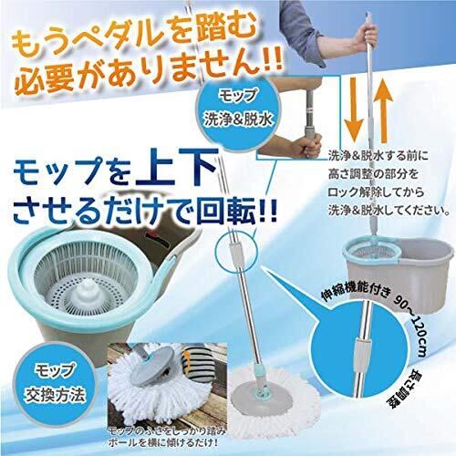 売れ筋回転モップがコンパクトになりリニューアル!ダブル回転で洗浄×脱水! 超カンタンもうペダルを踏む必要がありません。 モップを上下させるだけで回転します。 モップ部分はマイクロファイバー!! 小さなゴミやホコリなどの汚れがよく取れ、吸水・脱水性も抜群!!