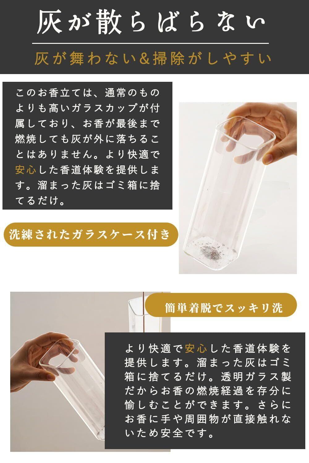 【灰が散らばらない】このお香立ては、通常のものよりも高いガラスカップが付属しており、お香が最後まで燃焼しても灰が外に落ちることはありません。より快適で安心した香道体験を提供します。溜まった灰はゴミ箱に捨てるだけ。透明ガラス製だからお香の燃焼経過を存分に愉しむことができます。さらにお香に手や周囲物が直接触れないため安全です。