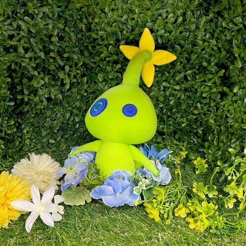 『ピクミン4』に登場するヒカリピクミンのぬいぐるみ。蓄光加工が施された生地を使用しているため、光を当てると暗いところで淡く光るよ!※環境により光り方は異なります。