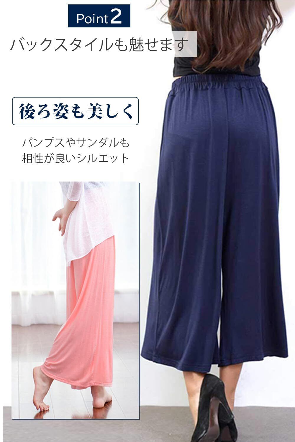 ストレスフリーでしかも肌触りが滑らかなので部屋着にもパジャマにもお使いいただける万能パンツです。フリーサイズですが、とても伸縮性があるのでウエスト100cmまで対応いただけ幅広い体型の方に着用出来ます。紐付きなので調節も可能。春夏秋冬、一年中着用、着回しできます。ロングタイプの9分丈で足長効果も期待です。