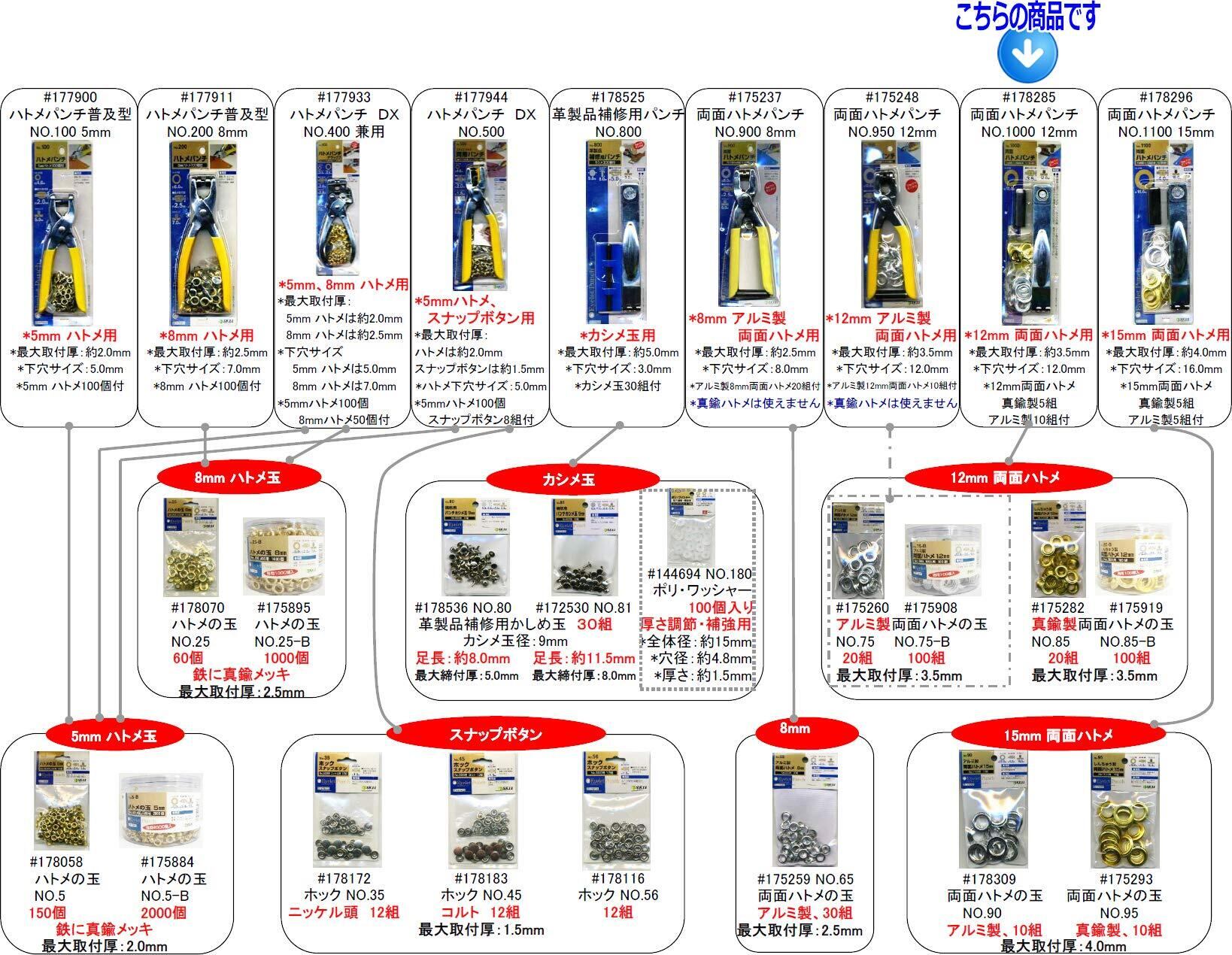付属品:12mm両面ハトメ(真鍮製5組・アルミ製10組相当)・12mm下穴ポンチ