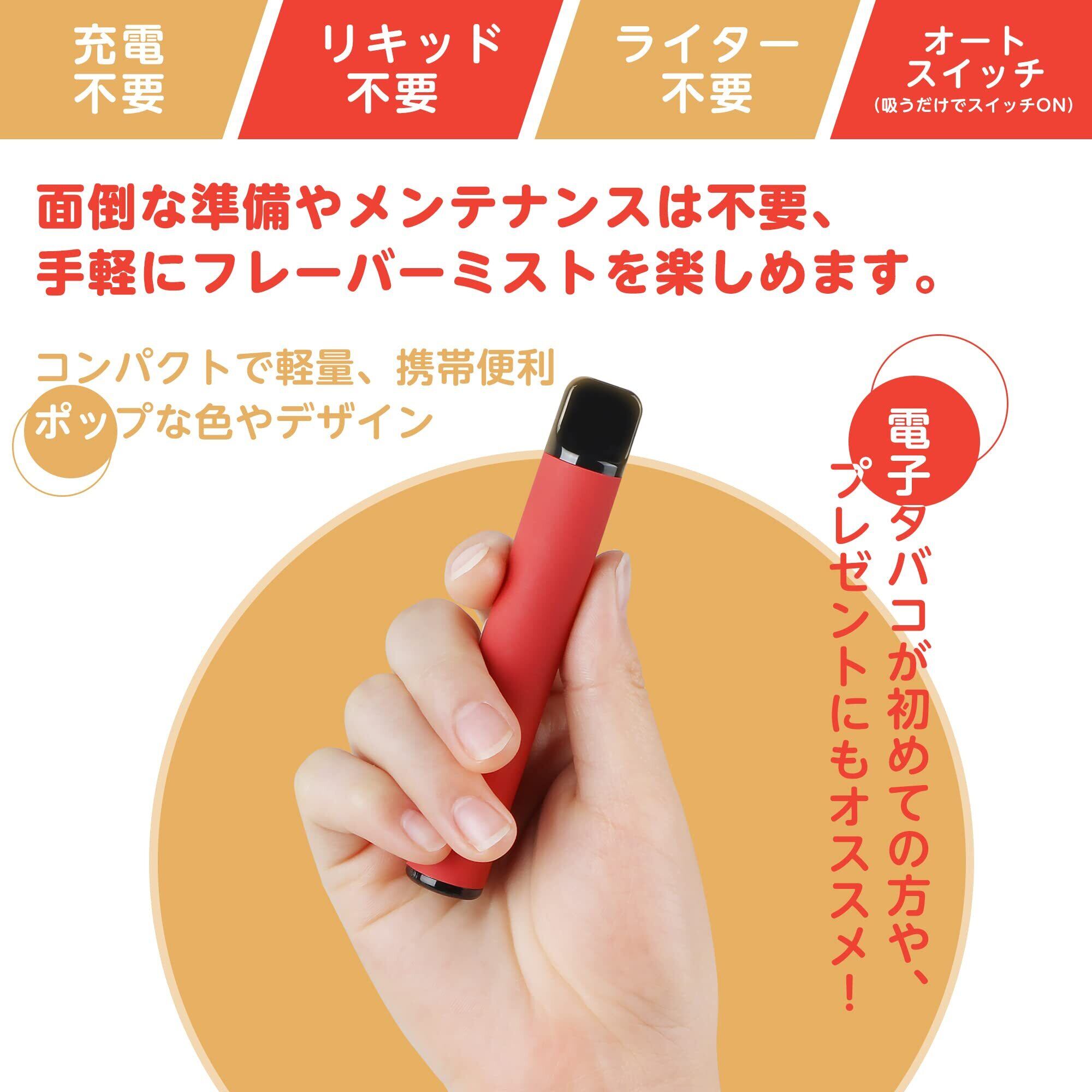 【面倒な準備やメンテナンスなし】充電不要・リキッド填充不要・オートスイッチなので吸うだけでスイッチON。ポップな色やデザイン、コンパクトで携帯便利。