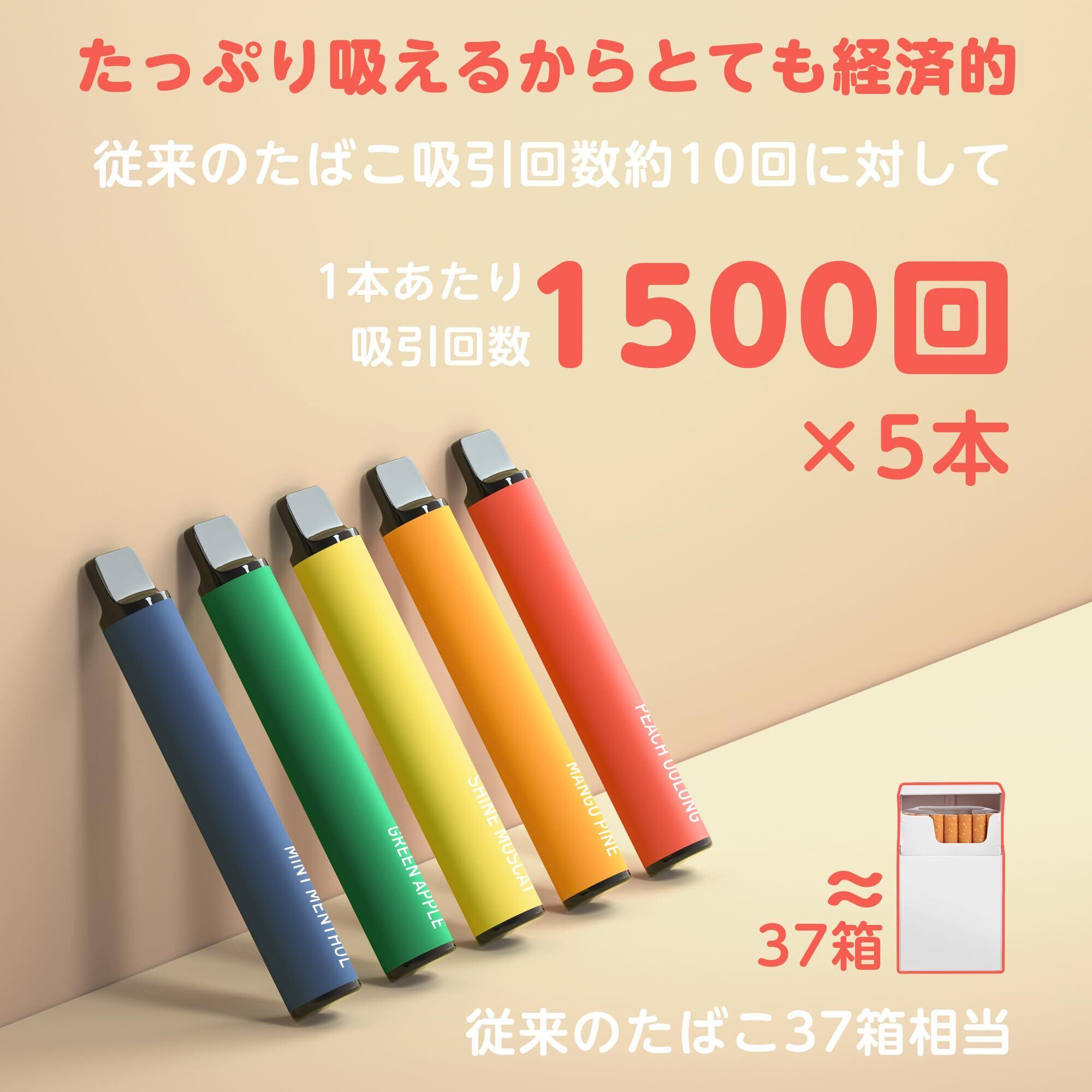 【最大パフ回数なんと7500回】大容量バッテリー内蔵、1本あたり1500回吸引できるからとても経済的です。5本セットで従来のたばこ37箱相当。(扱いの頻度と連続使用によって吸引回数は個人差があります)