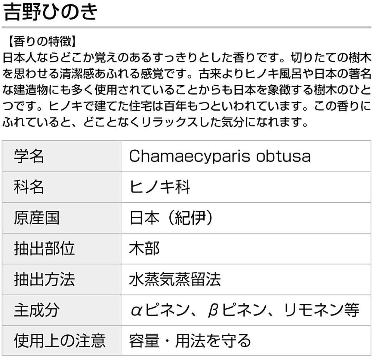 【内容】<BR>●吉野ひのき 5ml[紀伊半島]<BR>学 名 Chamaecyparis obtusa 科 名 ヒノキ科 原産国 日本(紀伊) 抽出部位 木部 抽出方法 水蒸気蒸留法<BR>●木曽ひのき 5ml[長野/木曽郡上松町]<BR>学 名 Chamaecyparis obtusa 科 名 ヒノキ科 原産国 日本(長野/木曽) 抽出部位 木部 抽出方法 水蒸気蒸留法 <BR>●四万十ひのき 5ml[高知県/四万十]<BR>学名 Chamaecyparis obtusa 科名 ヒノキ科 原産国 日本(高知/四万十) 抽出部位 木部 抽出方法 水蒸気蒸留法 <BR>