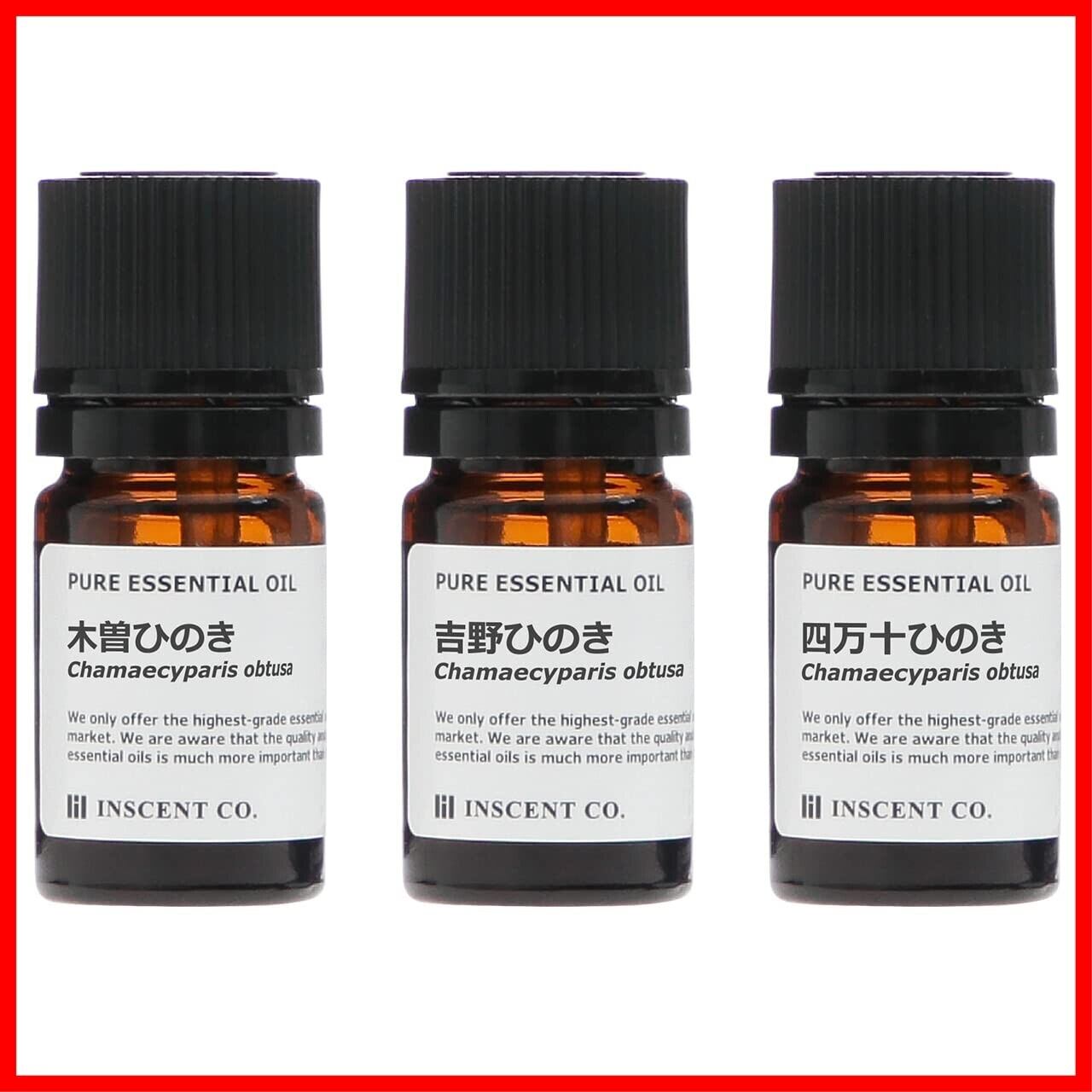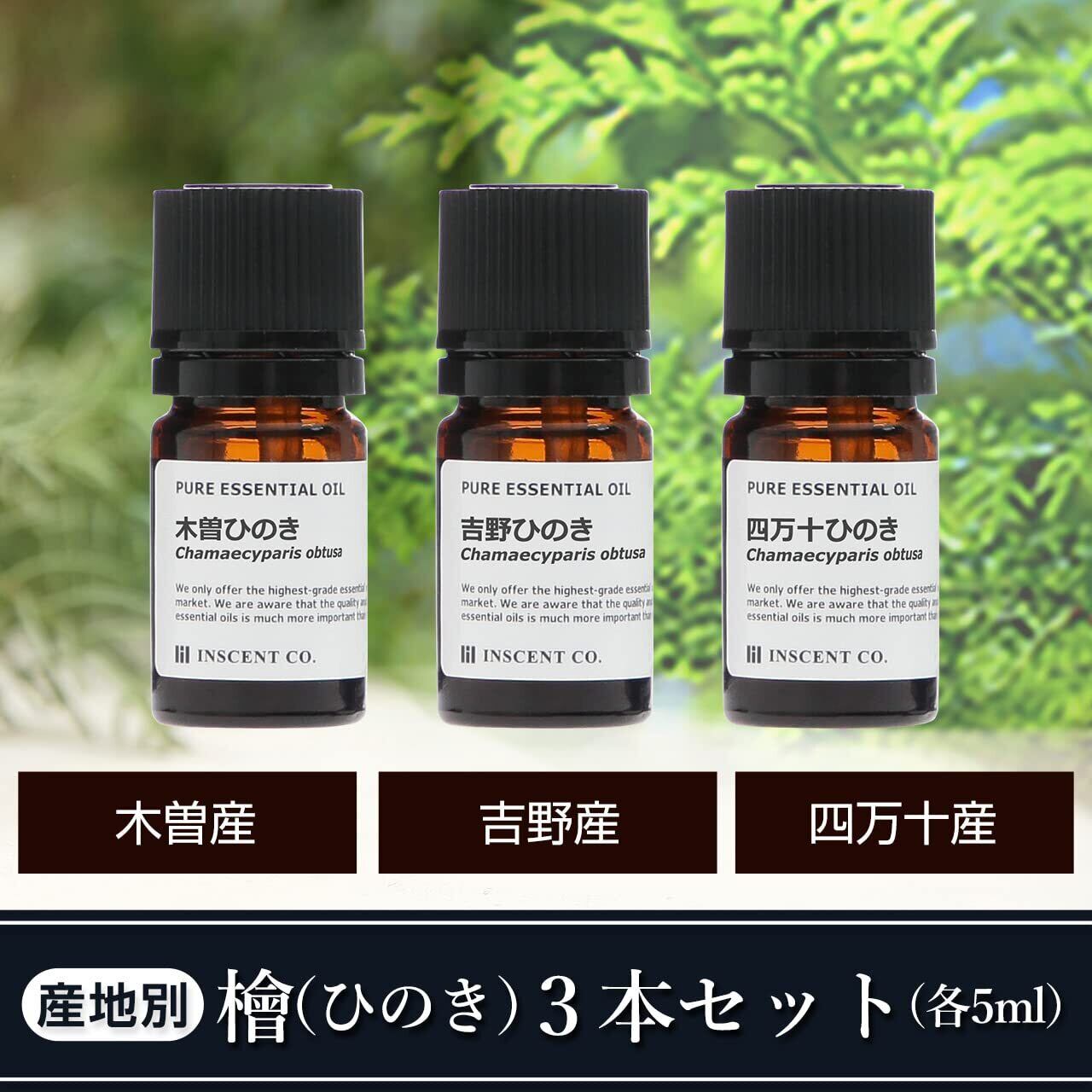 産地の違ったヒノキの3銘柄をセットにしました。(吉野ひのき 5ml[紀伊半島]/木曽ひのき 5ml[長野県/木曽郡上松町]/四万十ひのき 5ml[高知県/四万十])