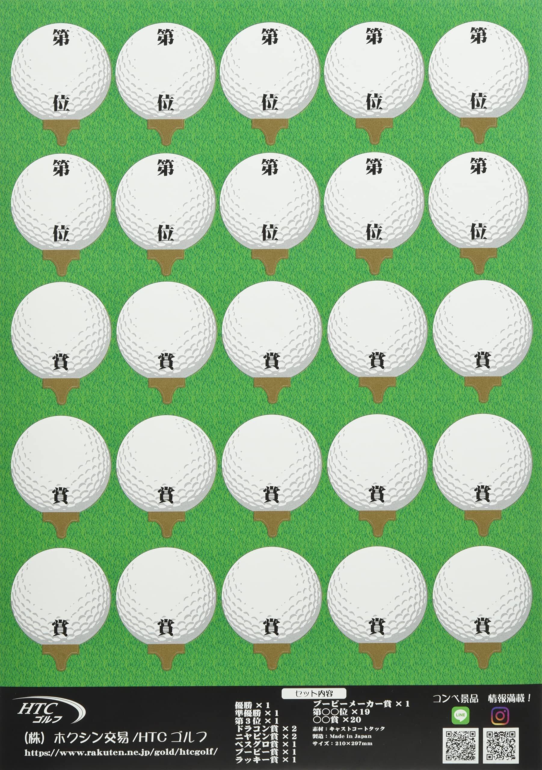 セット内容:優勝×1枚、準優勝×1枚、第3位×1枚、ドラコン賞×2枚、ニヤピン賞×2枚、ベスグロ賞×1枚、ブービー賞×1枚、ラッキー賞×1枚、ブービーメーカー賞×1枚、第○○位(書き込み用)×19枚、○○賞(書き込み用)×20枚、合計50枚
