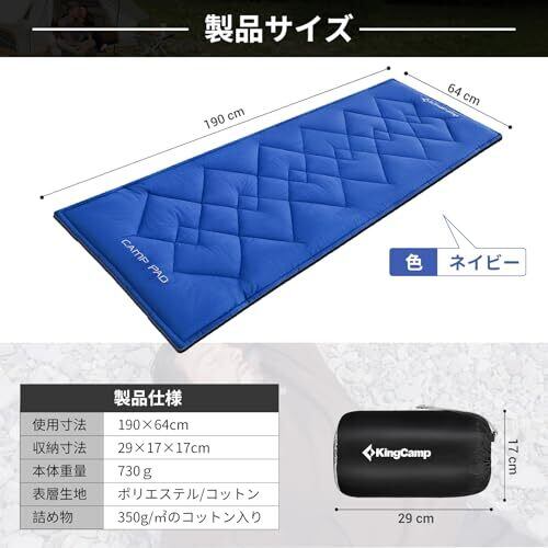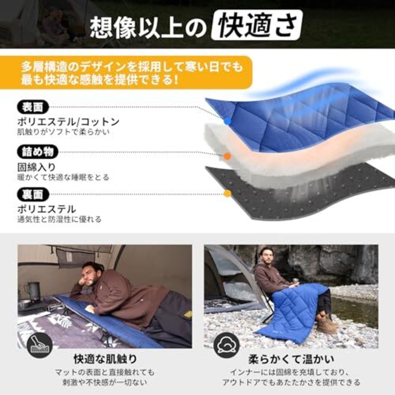【肌に優しい素材】表面にポリエステル/コットンを使用し、柔らかく快適な肌触りです。内側には350g/㎡の綿が入っており、アウトドアでも暖かく快適な睡眠ができます。