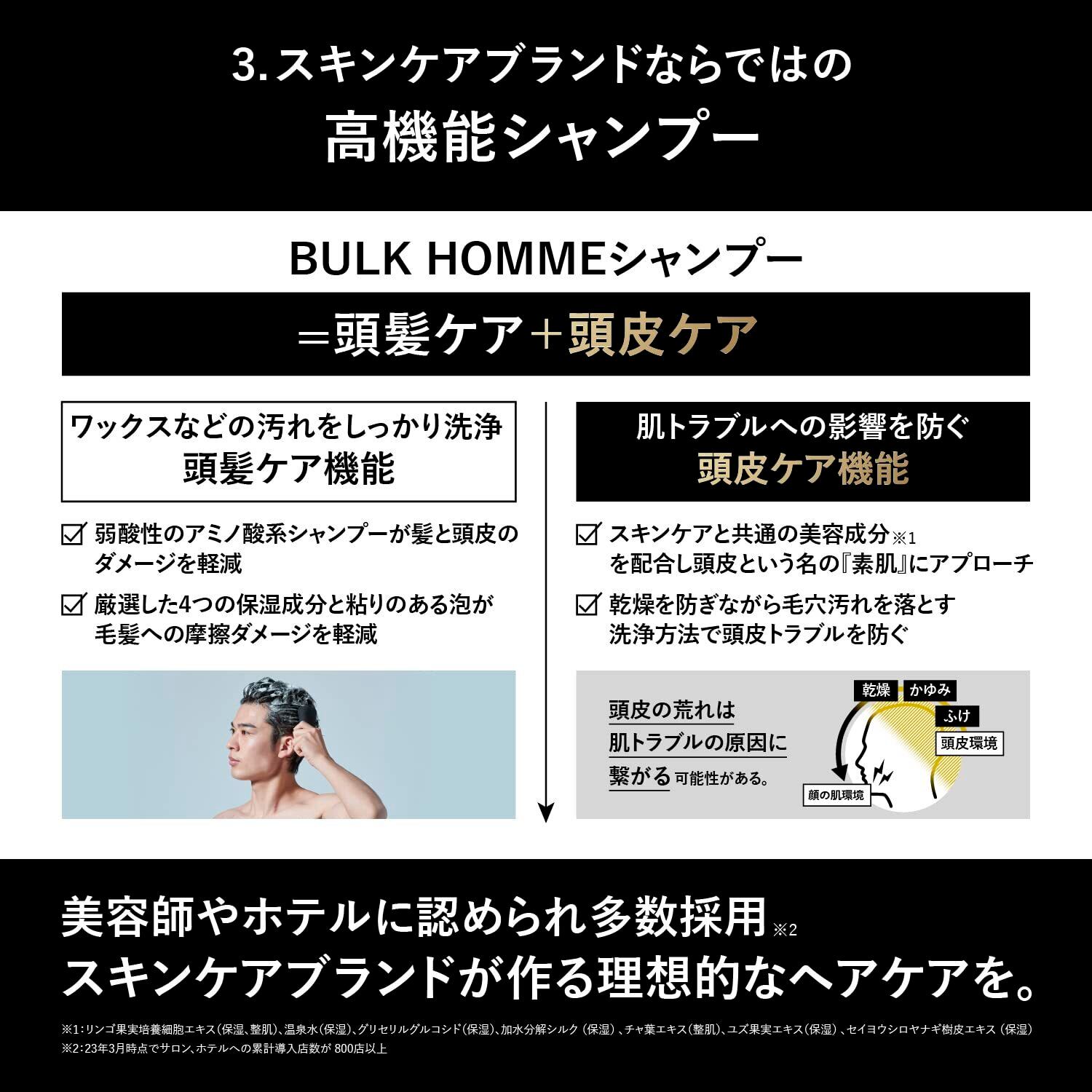 【男性の肌の特徴】素早い泡立ち、汚れをしっかり絡め取る濃密な泡質、少量でも根こそぎ汚れを落とすほどの洗浄力、泡切れの良さ、頭皮と髪への優しさ、これら全てに満足するシャンプーを目指して開発しました。
