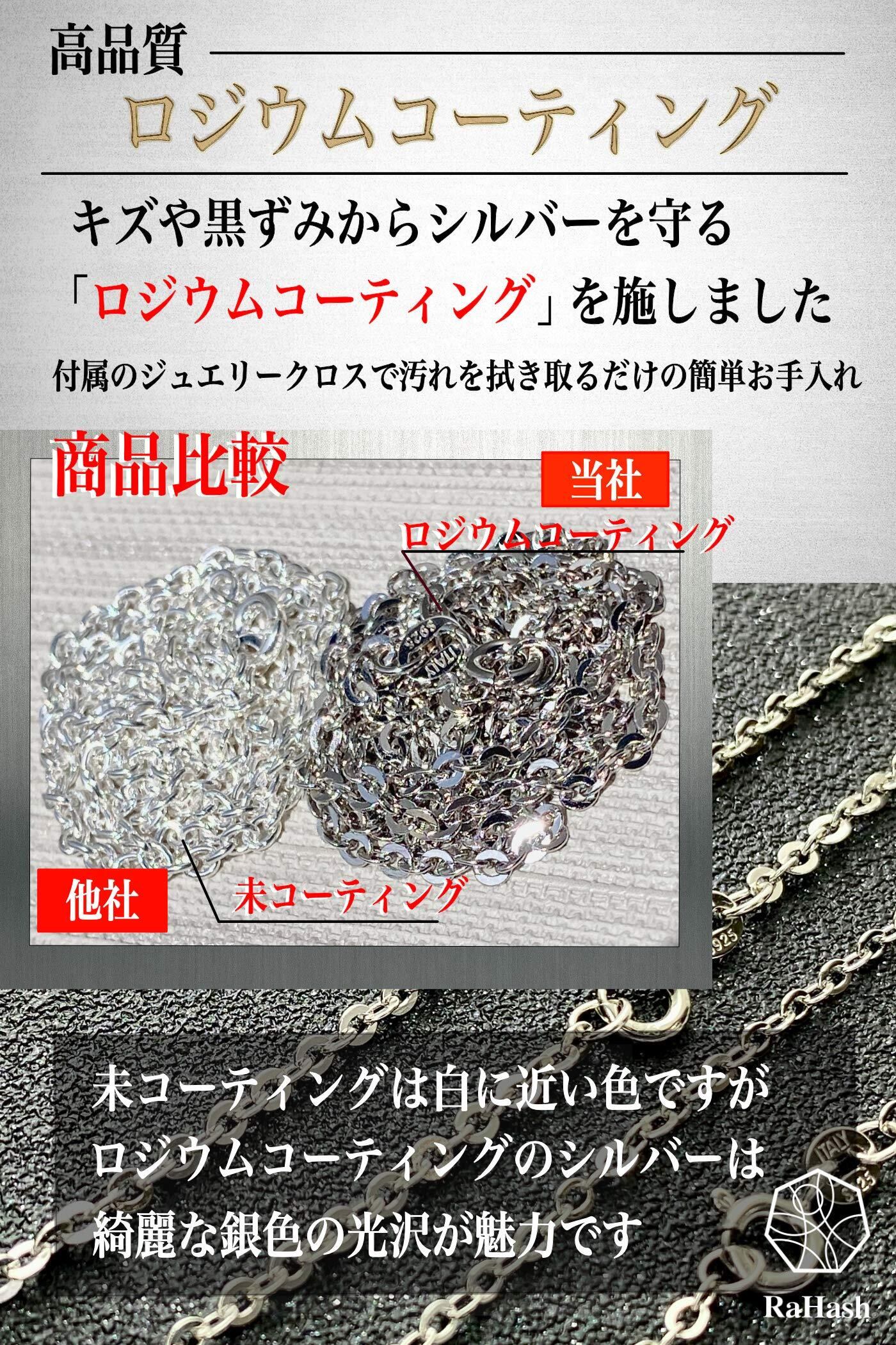 【高品質ロジウムコーティング】シルバー925素材のチェーンを、強度が高いロジウムコーティングで保護。シルバーアクセの弱点である「水・キズ・黒ずみ」から守り、毎日の使用にも耐えられる耐久性を実現しました。シルバーの変色もありませんのでお手入れ不要。いつでもプラチナのような美しく輝くチェーンをご着用いただけます。又、ロジウムはアレルギー性の極めて低い素材です。コーティングなしのシルバーチェンは白に近い色ですが、ロジウムコーティングのチェーンは銀色に近いプラチナのような光沢が楽しめます。あまりにも白すぎるチェーンを敬遠される大人の男性に支持されています。