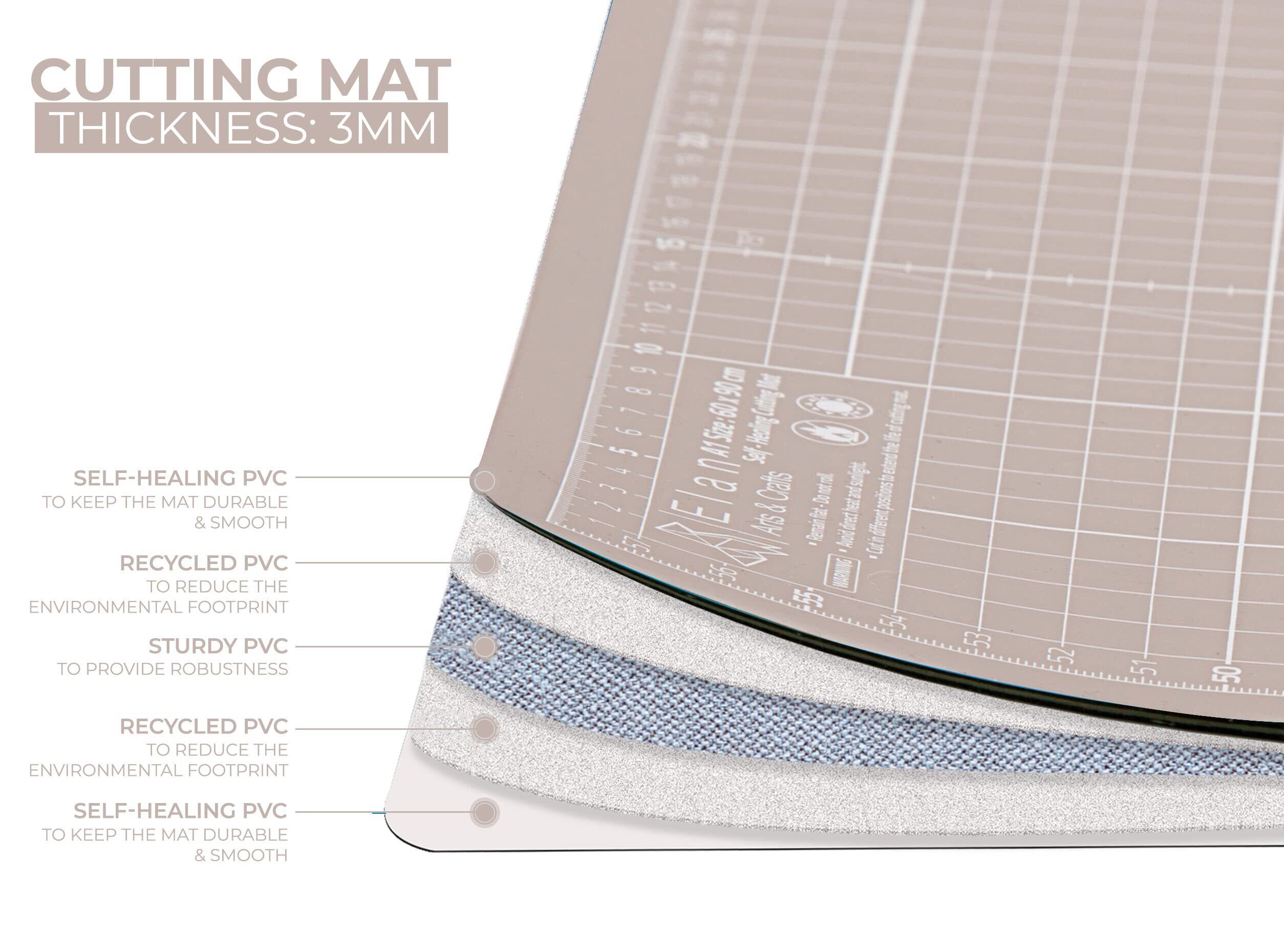 5重構造で自己再生:本製品は5重構造で傷が目立たないカッティングマットなので長くお使い頂けます。各層はそれぞれ別々のPVC素材を採用。切込みを入れた際に表面の自己再生マットが引っ張り合い傷を隠しスムーズな表面を保ちます。