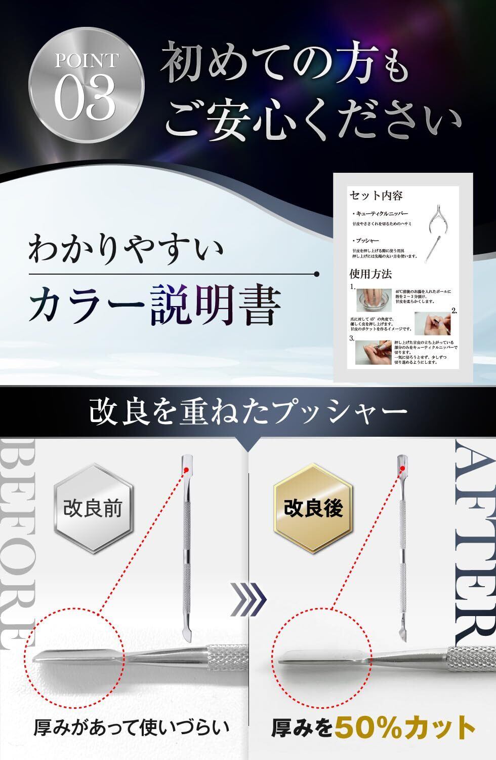 カラー説明書が付いているので、初心者の方でも簡単に使えます。※本製品は甘皮、ささくれ、さかむけをカットするものです。本製品を本使用目的以外の用途に使用しないでください。