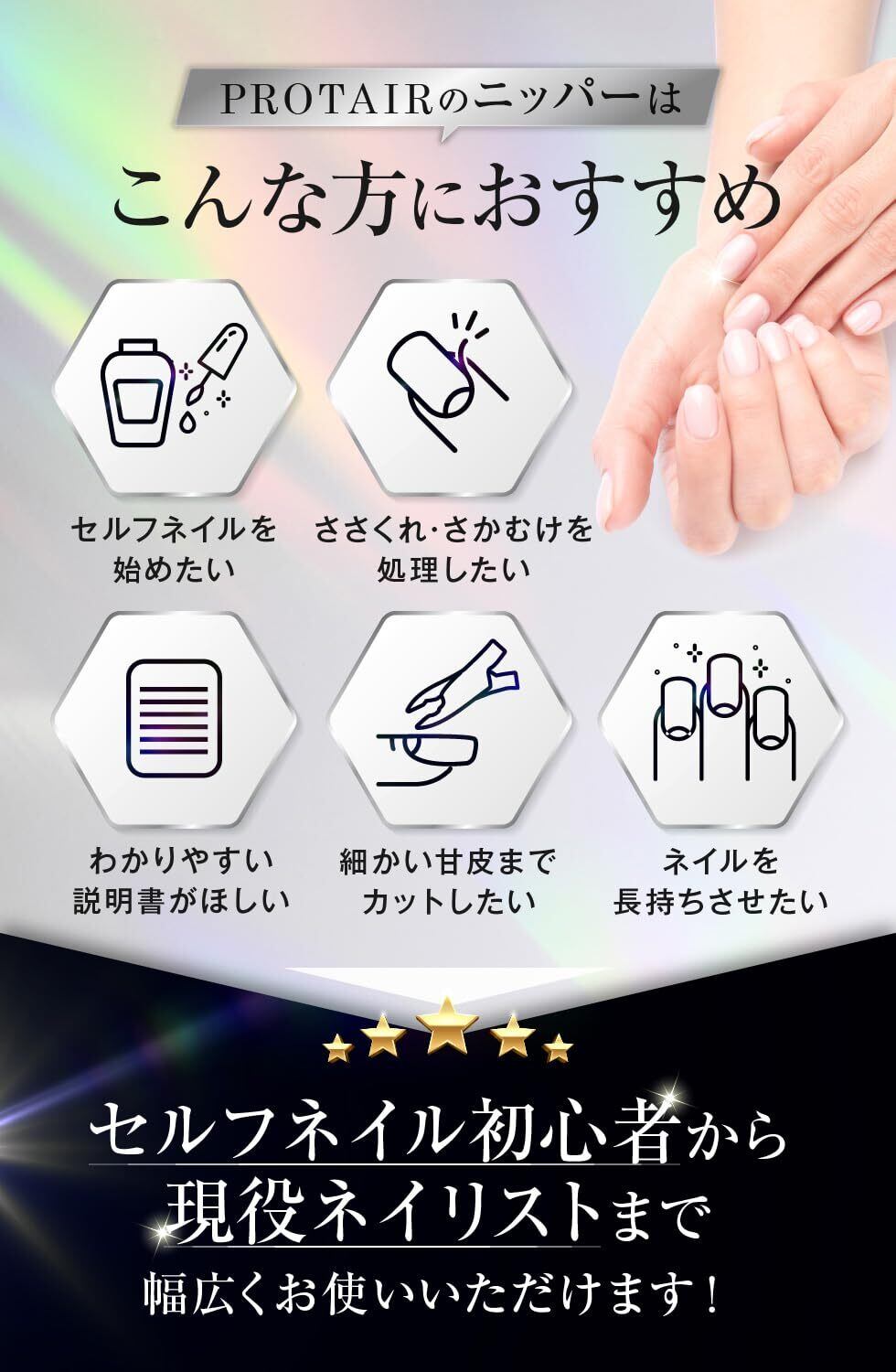 PROTAIRのネイルニッパーは刃先が5mmという絶妙なサイズなので、甘皮を簡単にカットできます。甘皮を処理したあなたの指先は、爪をより美しく魅せる事が出来ます。