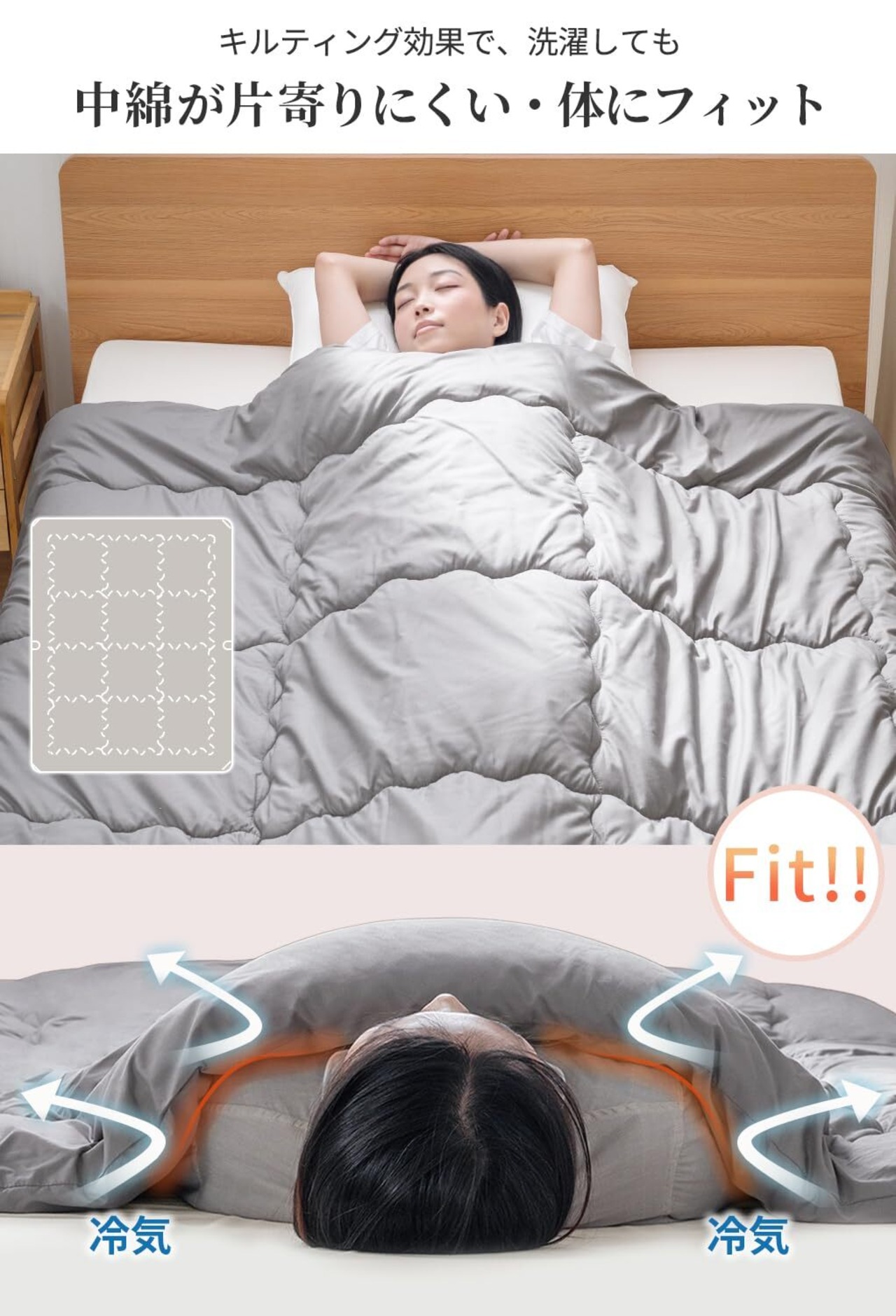 【柔らかな肌触り】ピーチスキン加工を表生地に施し、柔らかく滑らかな肌触りに。ほこりが出にくい、綿切れしにくい、中空ポリエステル綿を使用。