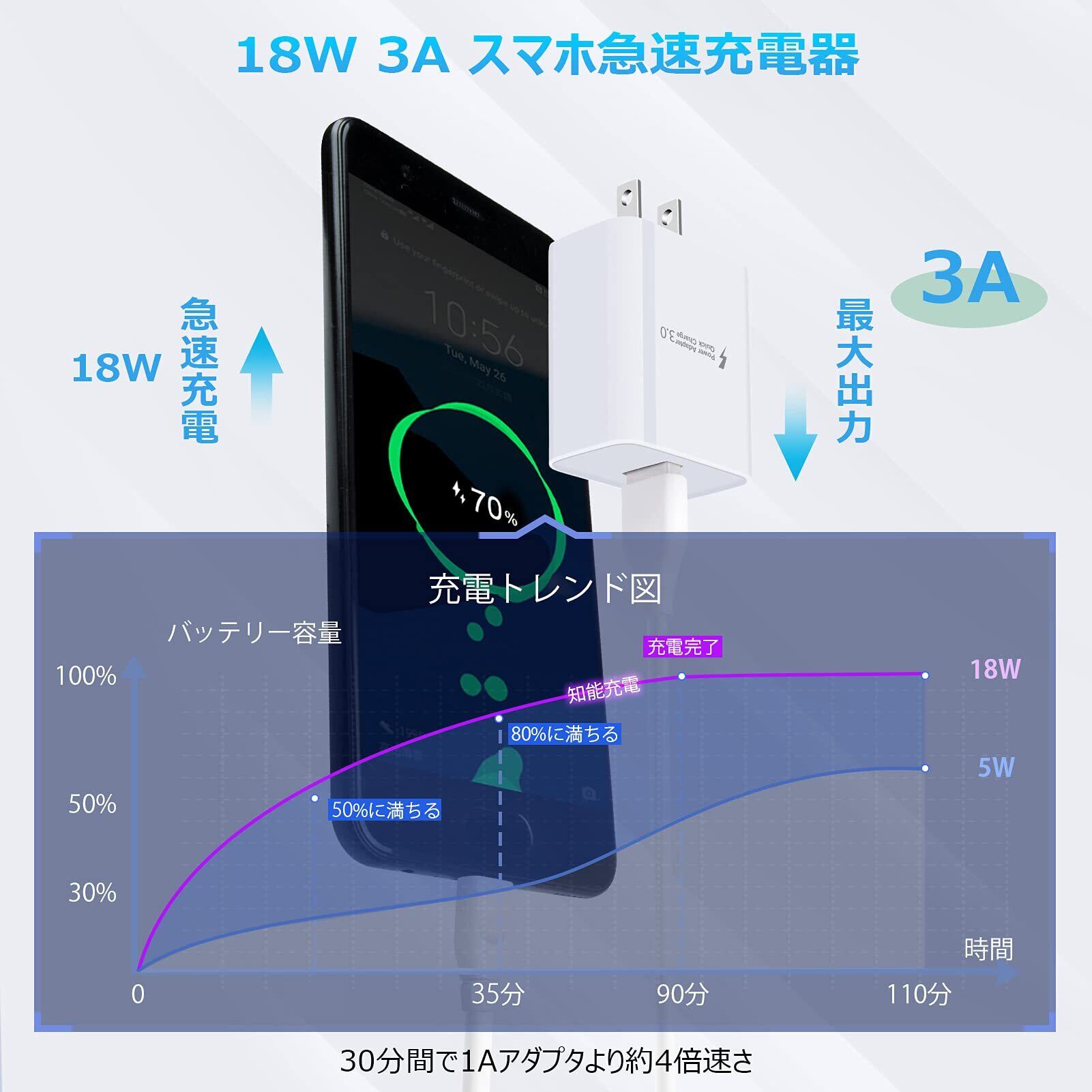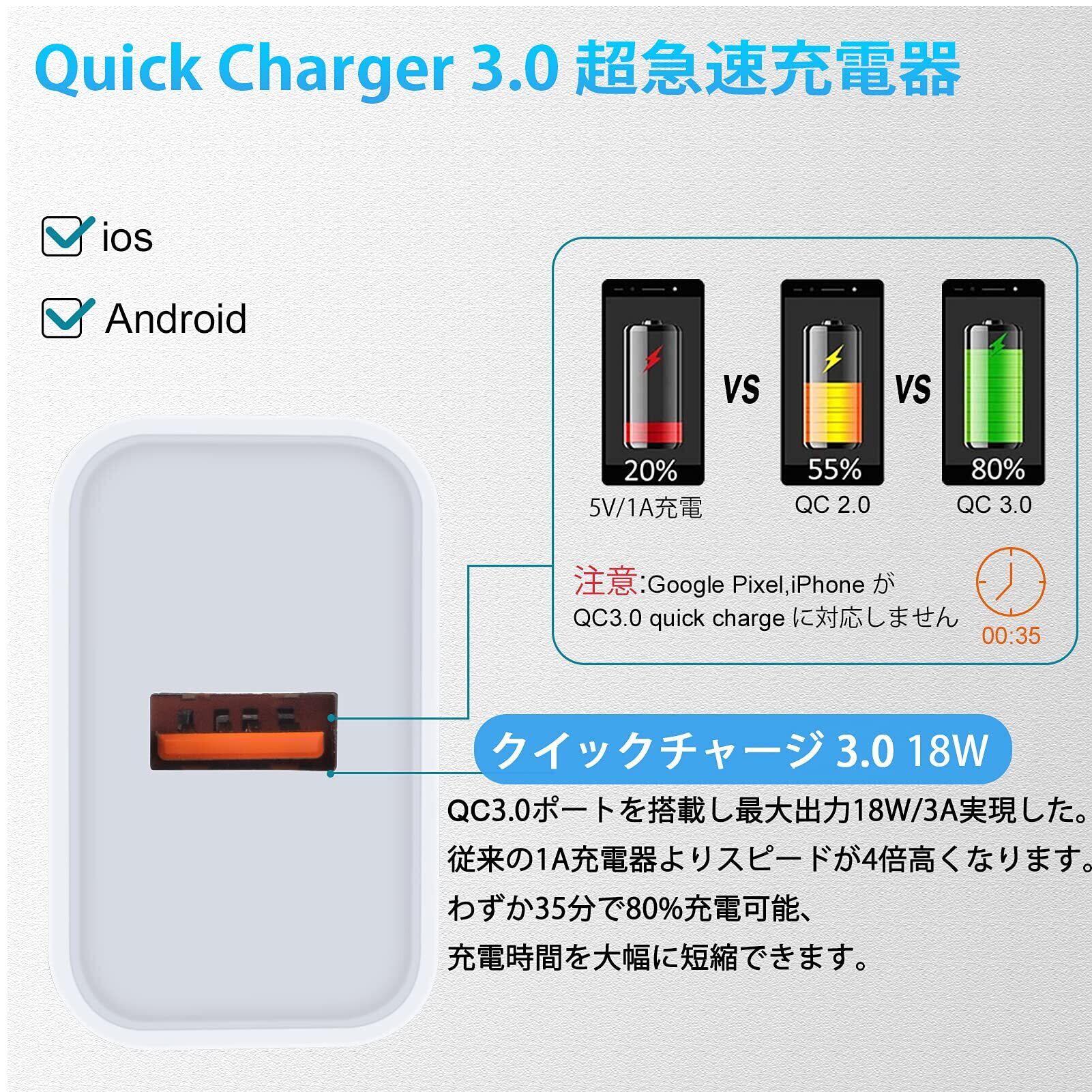 【Quick Charge 3.0急速対応・andriod用充電器】:最新のQuick Charge 3.0充電技術を利用し、すべてのQuick Charge 3.0 / 2.0 / 1.0 機器に対応します,最高 18W/3A の出力を実現して。対応機器をわずか35分で最大80%充電可能。比較的に、標準USB充電器に比べると、4倍以上で速いです。大幅に充電時間を短縮できます。(注:ワイヤレス充電器、置くだけ充電器などデバイスを急速充電にサポートなQC3.0/2.0アダプターです)。