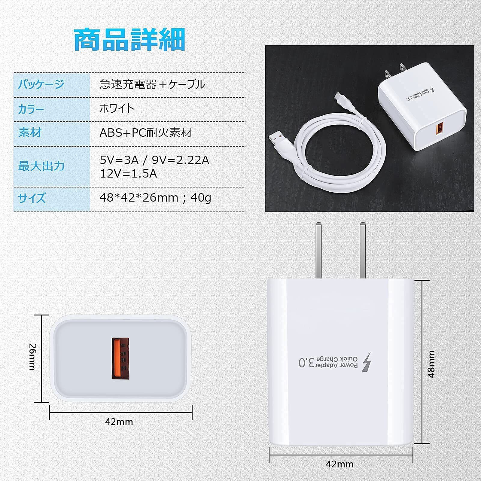 急速充電器 type-c Android 18W/3A スマホ USB-Cケーブル 1.83m/1本 QC3.0アダプター アンドロイド 携帯 Galaxy acアダプター タイプC電源コード USBコンセント Aquos zero6 R6 sense6Galaxy F52Note 20 20Ultra 10 9S22 S21 FE S20 S10 PlusA20s A42 A50s A51 A52 A70s A71 A80 A90Z Flip3 Z Fold3Moto G8 Z5 Z4 Z3 Play Z2 Z ForceLG G5 G6(ホワイト)