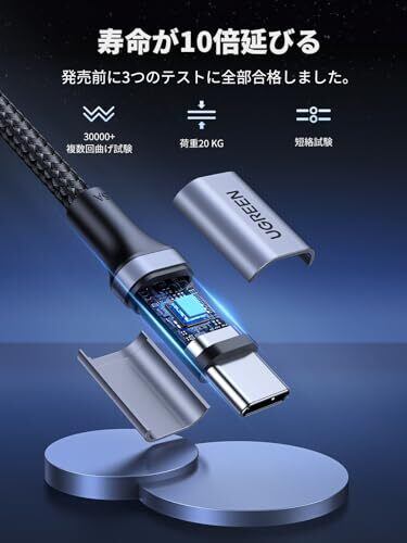 【耐久性と柔軟性を両立】UGREEN 5A USB Cケーブルは、コンパクトで信頼できるアルミニウム合金シェルとナイロン編まれたケーブルを使っている優れた高品質製品を提供します。ナイロンファイバー被覆構造で10000回以上の折り曲げ試験に合格し、一般的なUSBケーブルより寿命を4倍以上に向上する高耐久Type C ケーブルです。