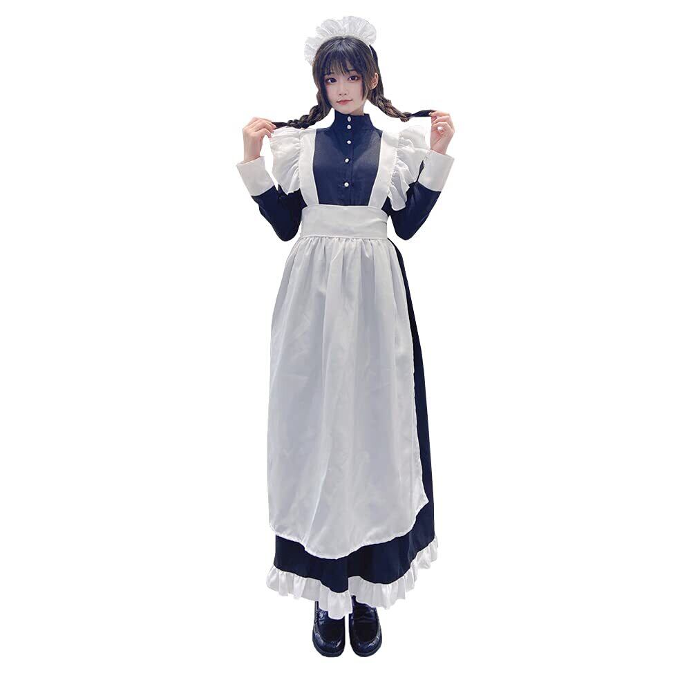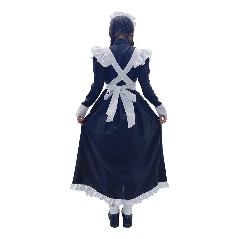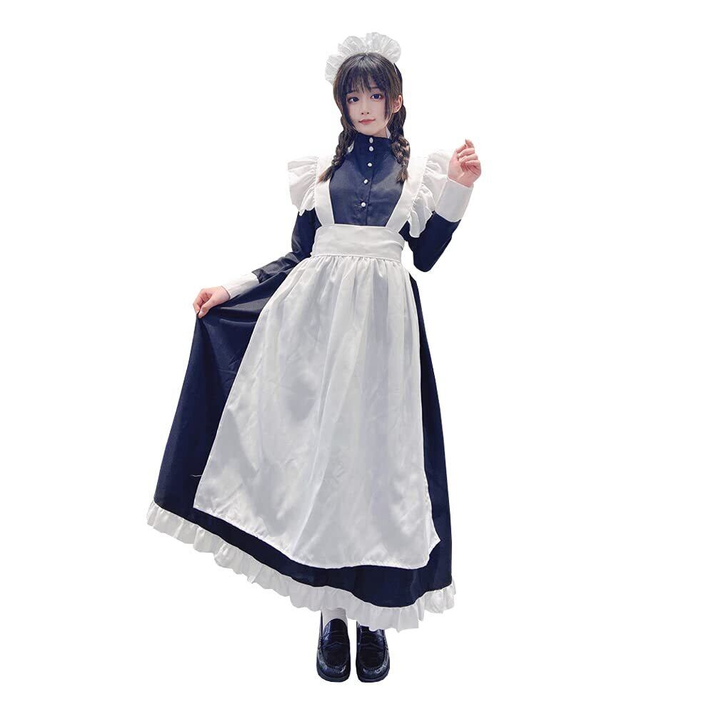 IRIWA 英国風 メイド服 ロング 黒白 ワンピース ハロウィン コスプレ衣装4点セット クラシカル 長袖 女性 男性用 大きいサイズ メイド コスチューム (ワンピース エプロン カチューシャ グローブ) (M サイズ)