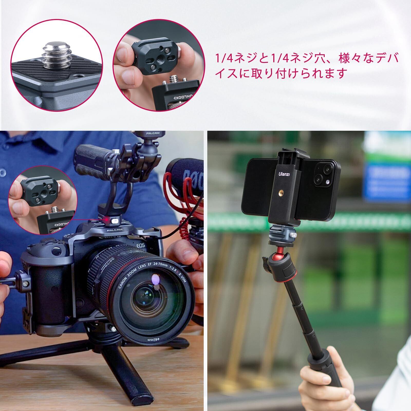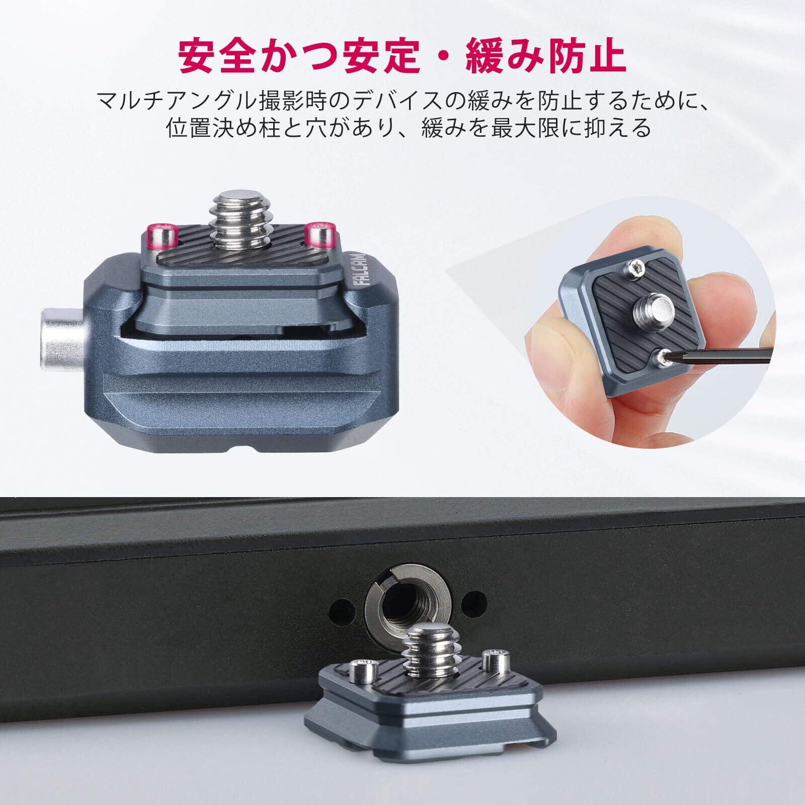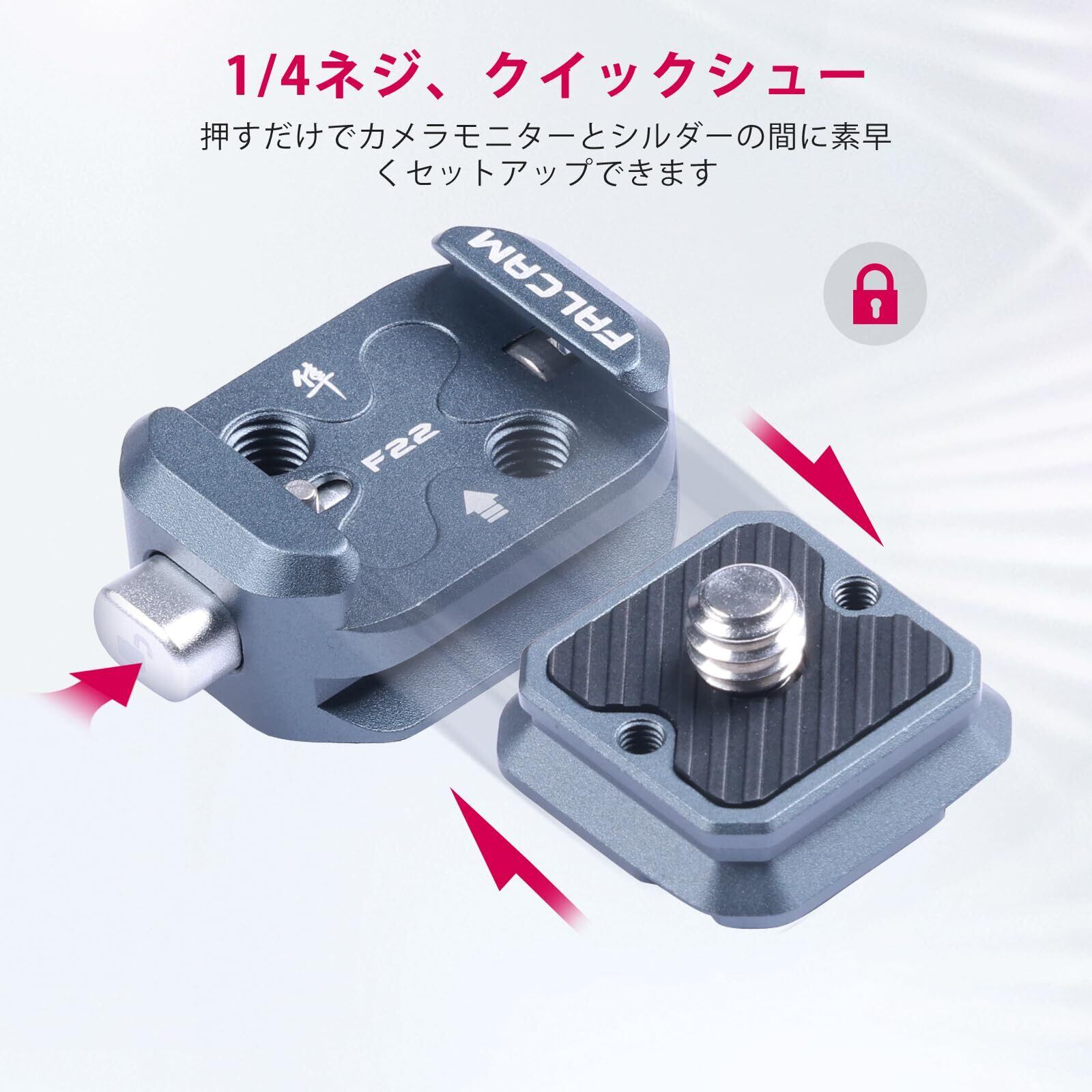 ▶【幅広い互換性】1/4インチネジを採用しているので、F22 QRシステムを三脚、一脚、ボールヘッド、モニター、マイク、フィルライト、バッテリー、シグナルレシーバーなどの機器と簡単に接続できます。F22 QRシステムを使えば、従来のクイックリリースプレートを使うよりもはるかに素早くアクセサリーを交換することができます。