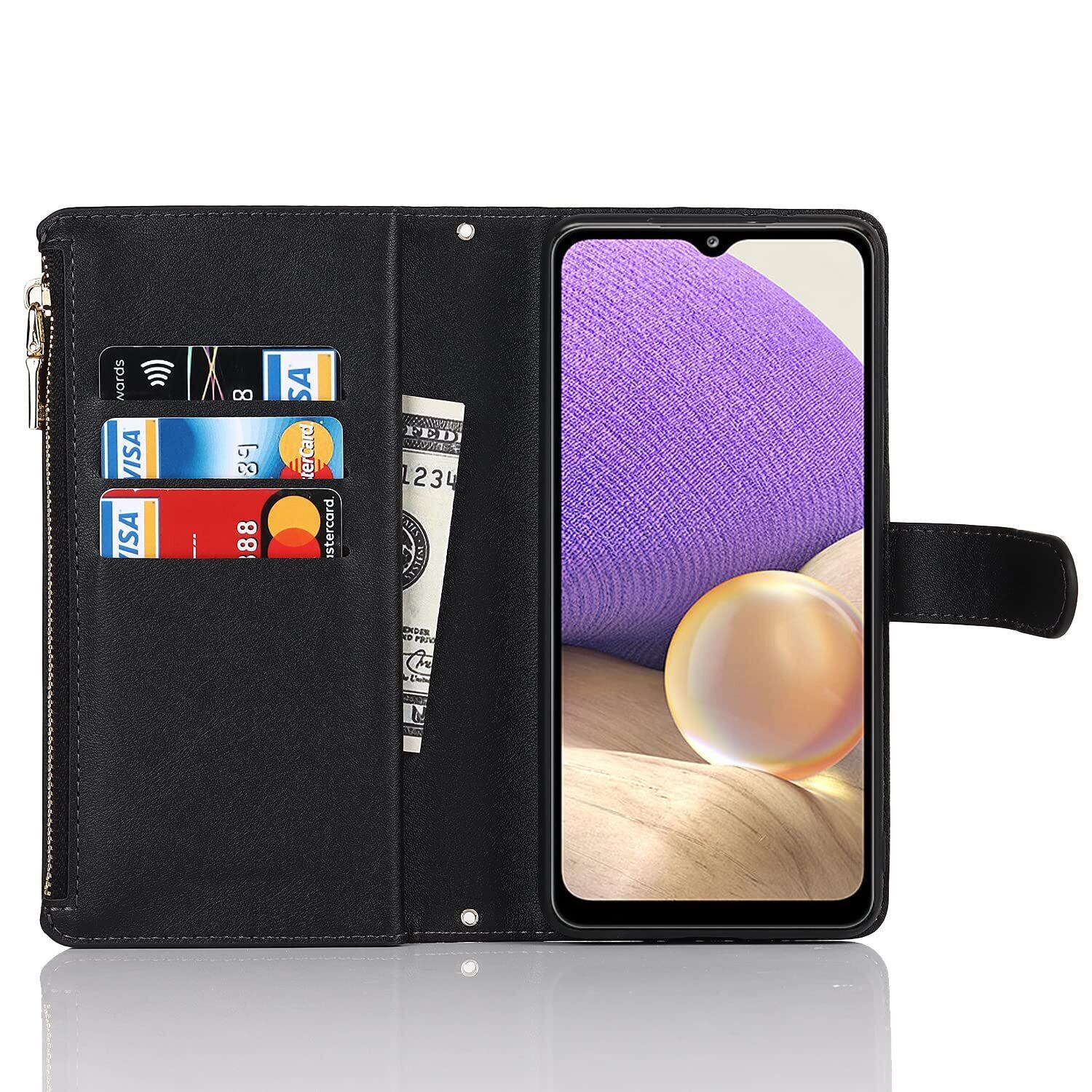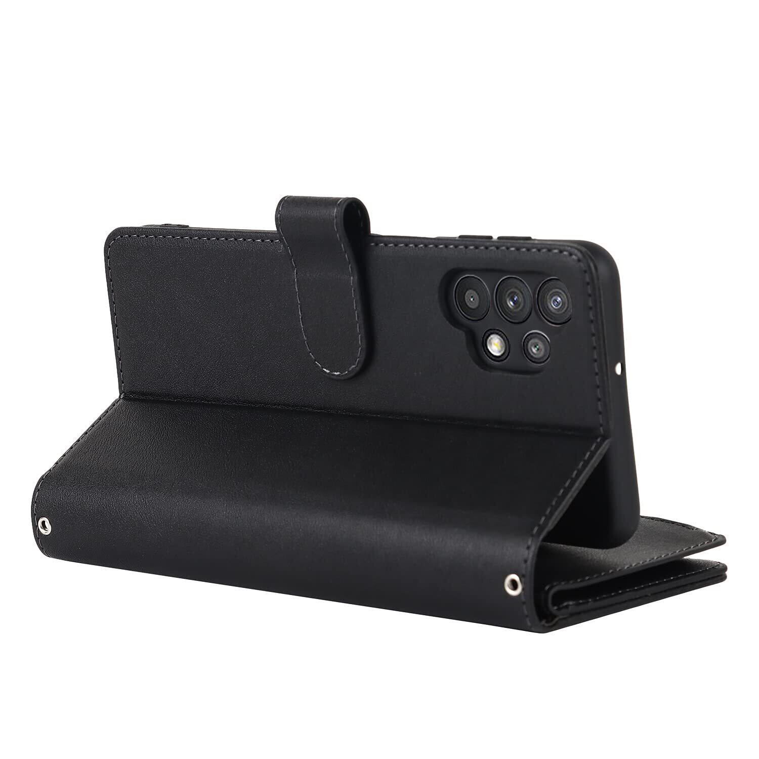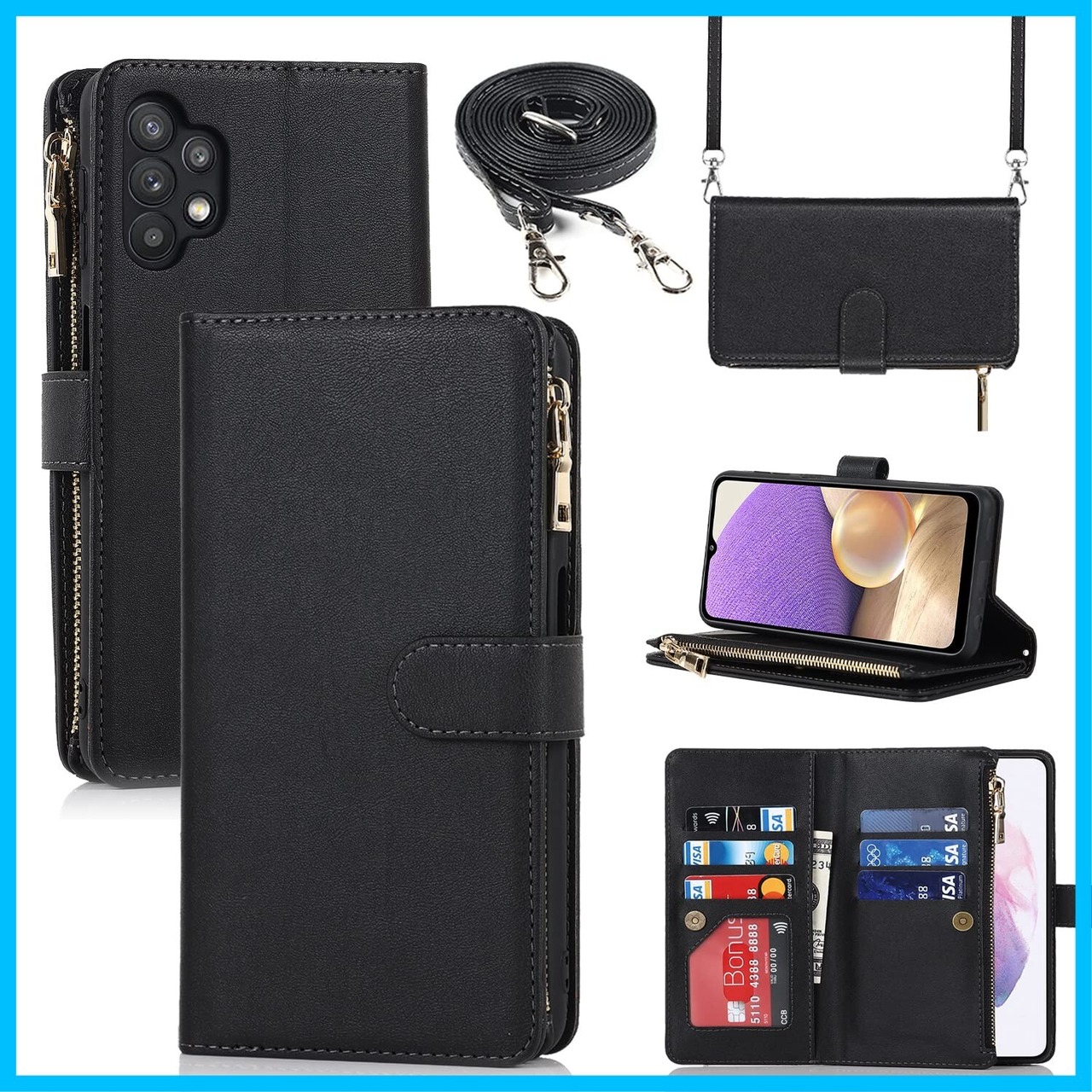 Pelanty for Galaxy A32 5G 縄掛けケース手帳型 SCG08 携帯カバー 肩掛け斜めがけ ショルダー 合成皮革+TPU マグネット 財布型カバー ICカード お札入れ小銭入れ大容量 収納ポケット スタンド機能 サムスン ギャラクシーA32 5G ストラップ付き 落下防止 耐衝撃 全面保護(肩縄付き-ブラック)