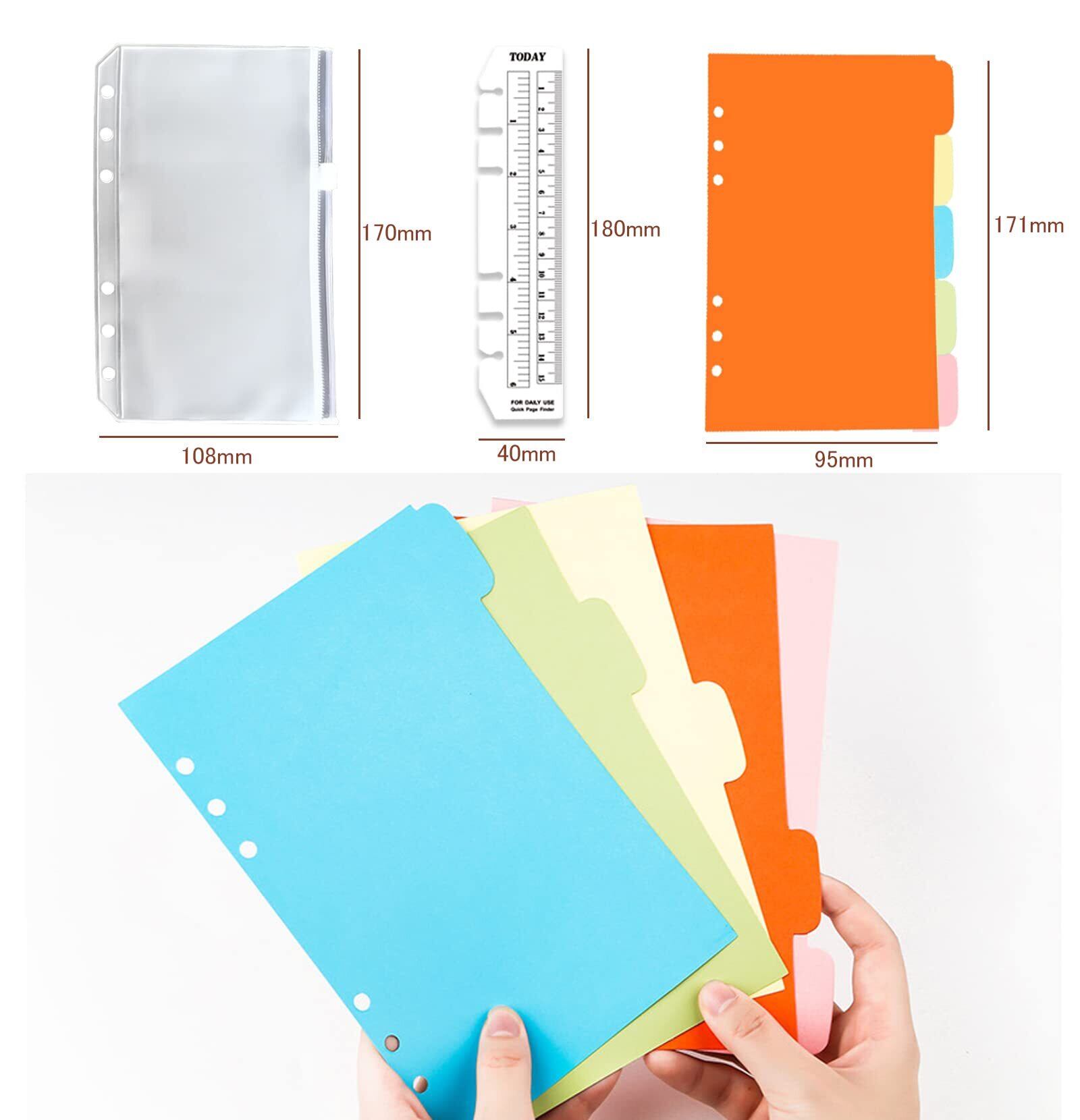 【お得なシステム手帳リフィルセット】パッケージ内容:6穴A6手帳リフィル3冊×45枚+ファスナーポケット×2枚+カラーインデックス*5枚+しおり定規×1枚