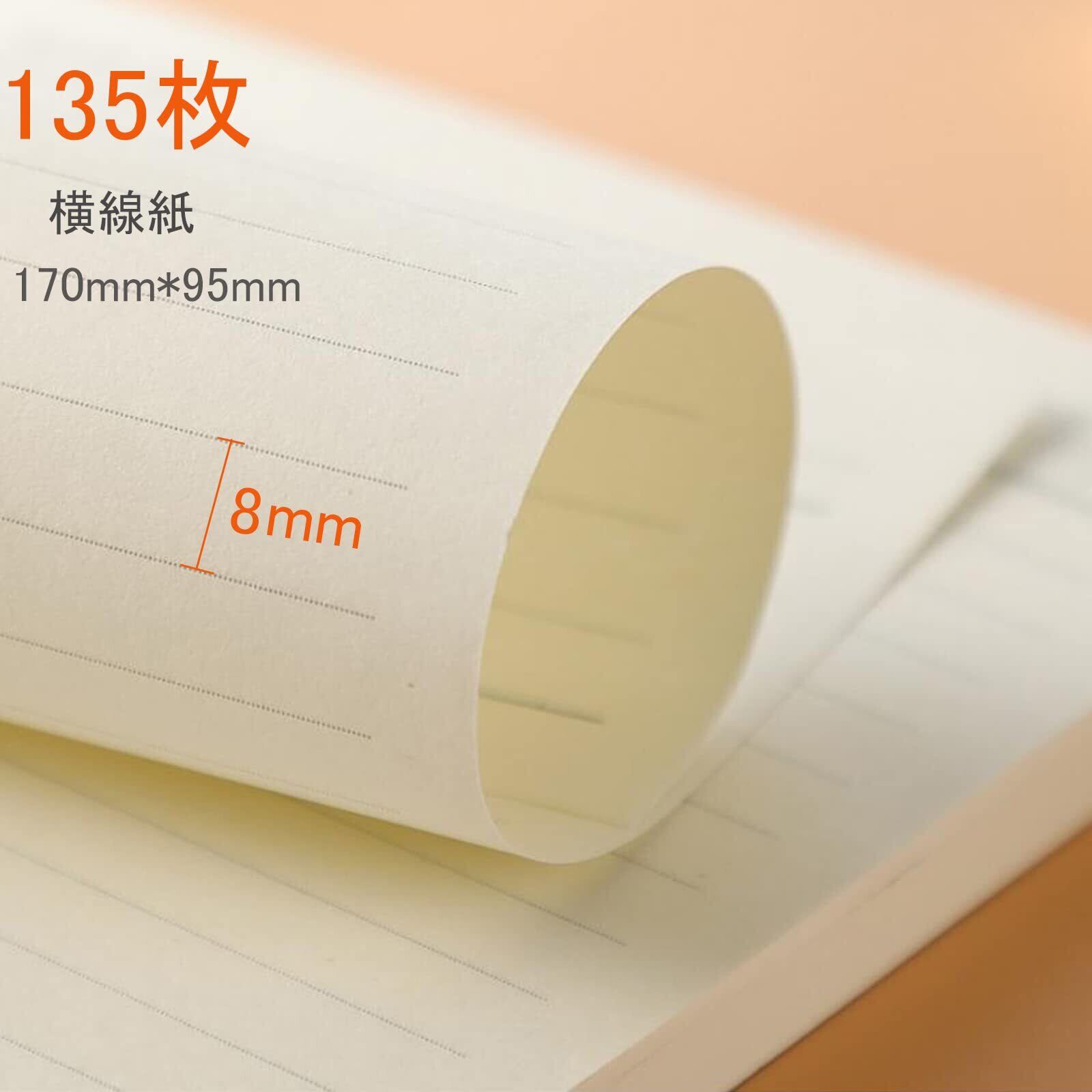 【書きやすい横罫システム手帳リフィル135枚】白い紙だと光を反射しやすいので、目に優しい淡いクリーム色を採用していて、長時間紙面を見つづけても目が疲れにくいです。インクの裏抜け、透け感が一般の用紙に比べて優れたリフィル専門紙を使用しています。コピー用紙より厚紙で、ペン先が引っかかりにくく書き心地が滑らか、加えて裏抜けしにくい特性で、ボールペン、万年筆、ゲルインキボールペンなどに最適な用紙です。