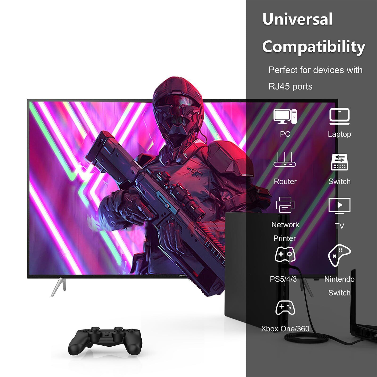 既存のCAT5、CAT5E、CAT6、Cat6a LANケーブルなどと互換性があります。両端はRJ45コネクタ付き、ルータやスイッチ、スマートテレビ、Xbox、PS2、PS3、PS4、PS5などのデバイスに適用します。