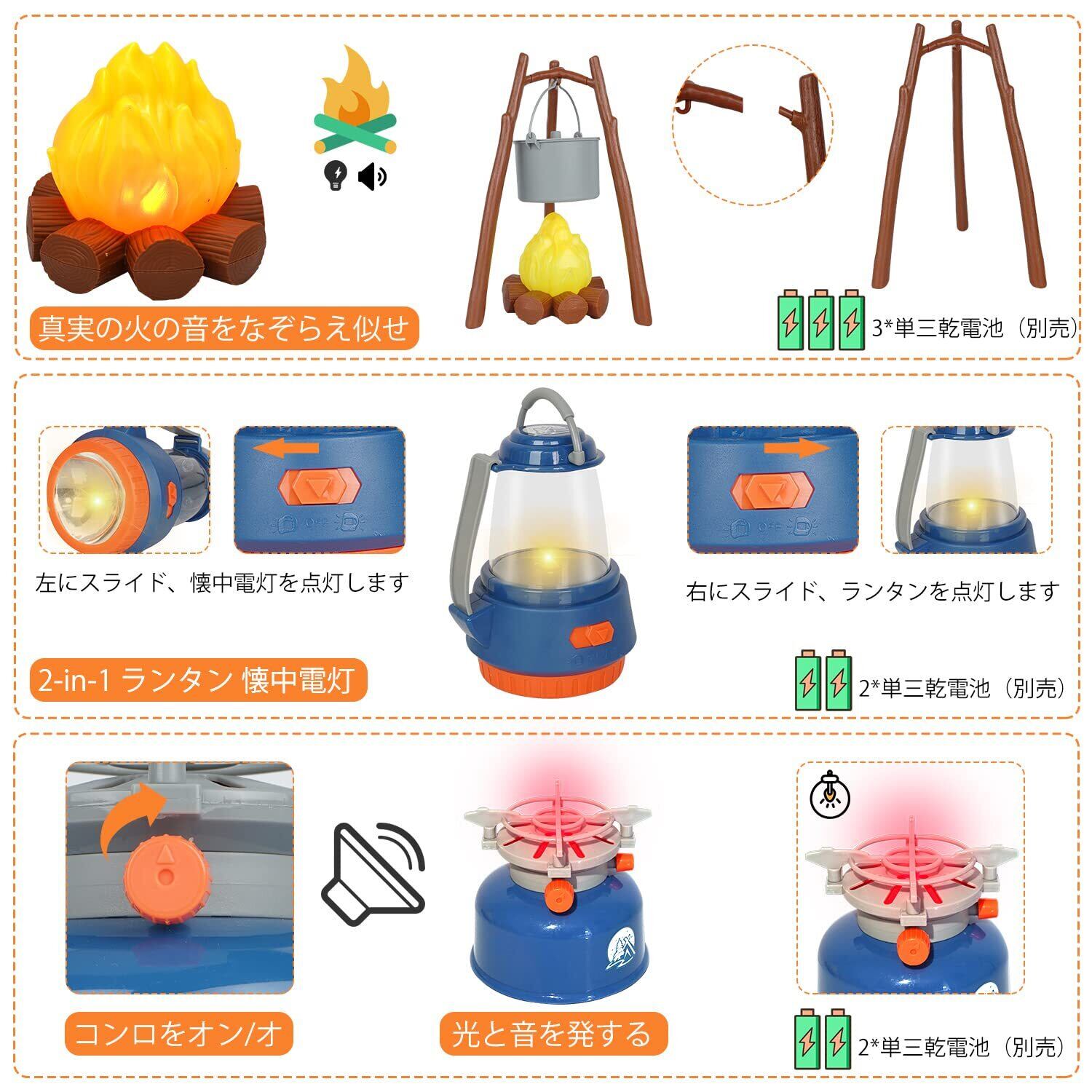【2-in-1ランタン・懐中電灯&コンロ】懐中電灯は点灯できます。ボタンをスライドするだけで簡単にランタンと懐中電灯に切り替わります。コンロは迫真の音を立てて、ゲームをよりリアルにすることができます。ランタンもコンロも単3電池2本必要(含まない)。このキャンプセットを通して、小さな探検家は昆虫採集道具で昆虫を捕まえたり、おままごとをしたり。また、両親は一緒に遊ぶことでキャンプスキルを子供たちに教えることができ、親子関係を強めることができます。