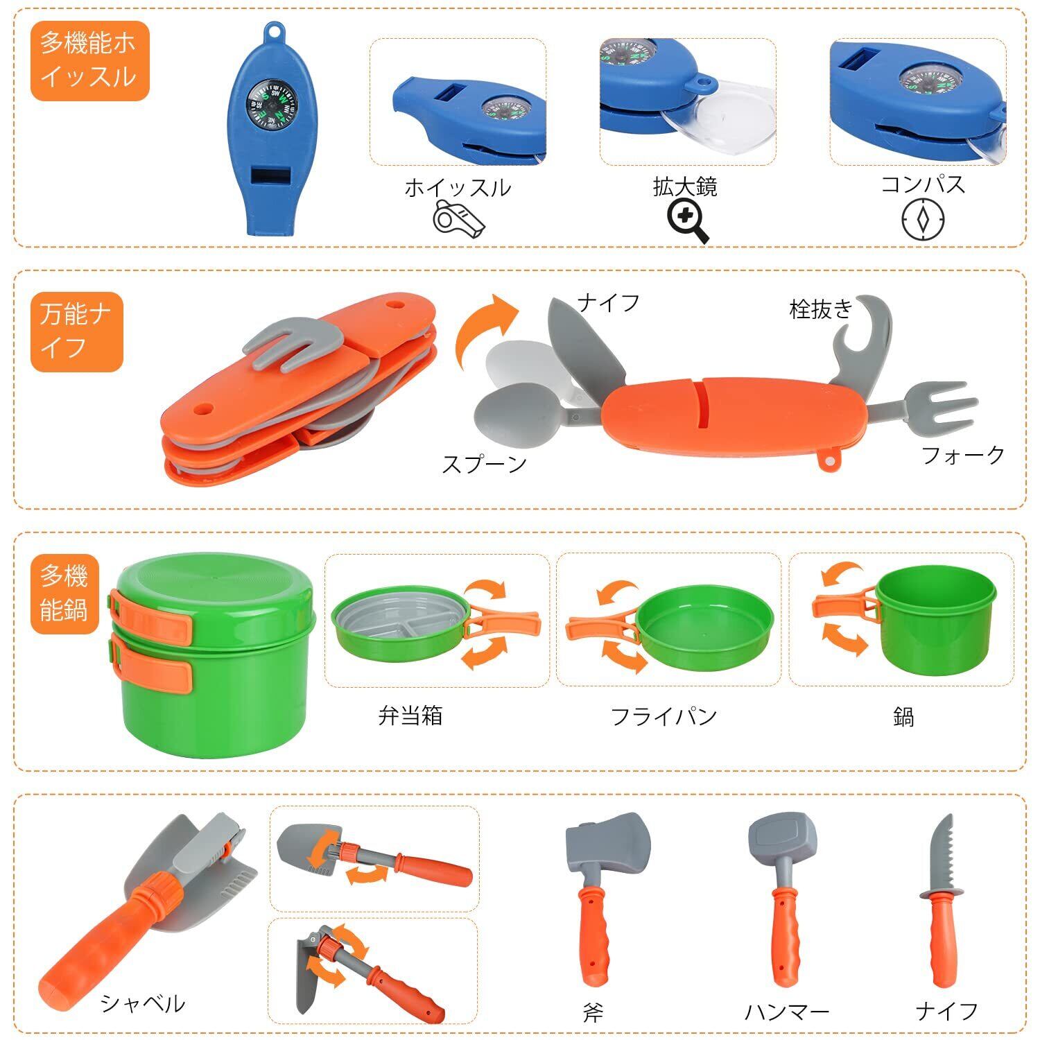 【豪華な38点セット】このキャンプテントセットはアウトドアやキャンプが好きな子供たちのために設計されています。豪華な38点セット:折り畳めるテント、キャンプファイア、 支柱、鍋、2-in-1ランタン・懐中電灯、コンロ、双眼鏡、多機能鍋(フライパン,弁当箱,鍋)、多機能ナイフ・フォーク、多機能ホイッスル(ホイッスル,拡大鏡,コンパス)、斧、ハンマー、ナイフ、シャベル、野菜、果物、昆虫、昆虫採集キット( 虫取り網、バグ転送ツール、3倍の拡大鏡)は様々なコスプレできます。キャンプ/キャンプファイア/おままごと/バーベキュー/昆虫採集など子供たちは自分の想像力で様々な模擬ゲームが体験できます。