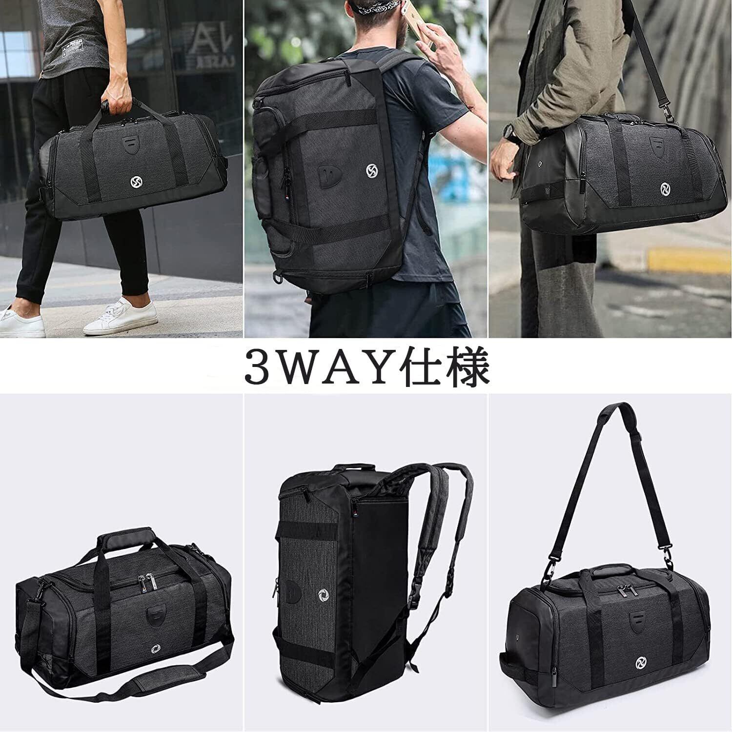 Bosiduスポーツバッグ メンズ ダッフルバッグ メンズ ボストンバッグ ジムバック リュック型可能 3way 旅行バッグ シューズ収納 大容量 防水 軽量 乾湿分離 アウトドア ユニセックス 人気 ブラックブラック