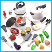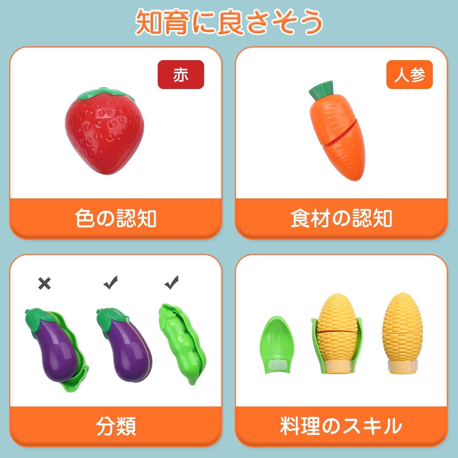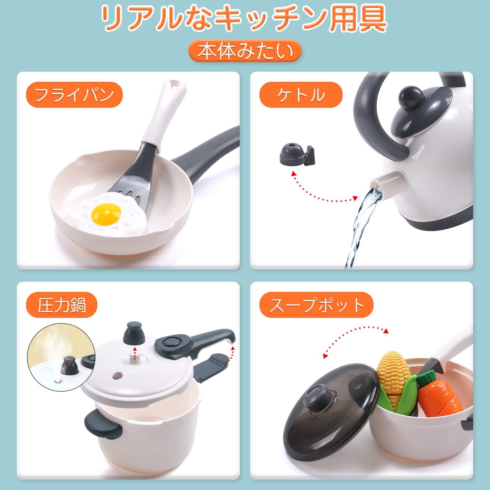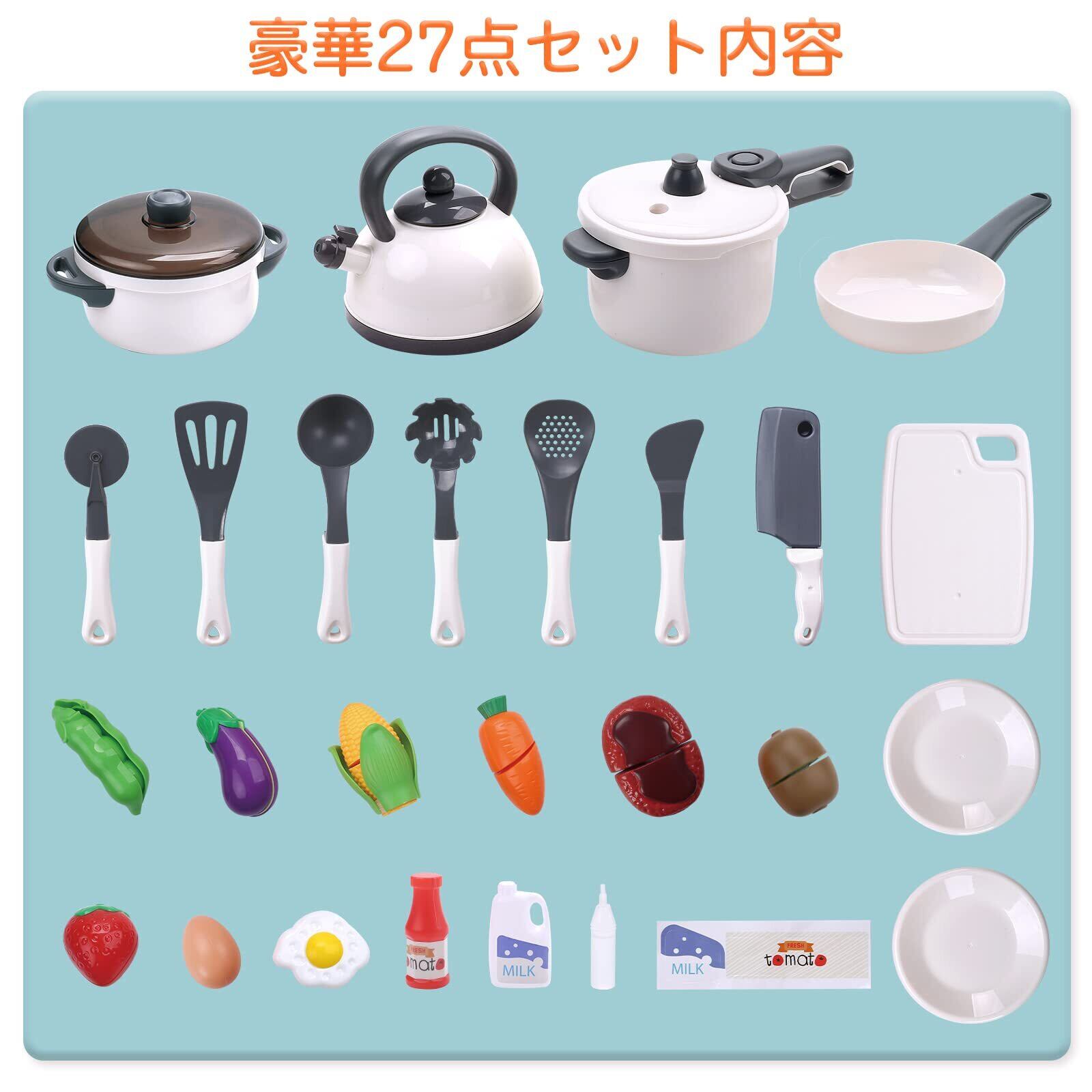 【おままごと 調理セット】リアルな調理器具、食材を切ることで、料理人ごっこに夢中しよう!セット内容:圧力鍋*1 お鍋*1 フライパン*1 ケットル*1 調理器具*6 ナイフ*1 プレート*2 まな板*1 水瓶*1 ケチャップ*1 ミルク*1 ステーキ*1 卵焼き*1 卵*1 イチゴ*1 とうもろこし*1 バナナ*1 オレンジ*1 エンドウ豆*1 ナス*1 人参*1 キウイ*1