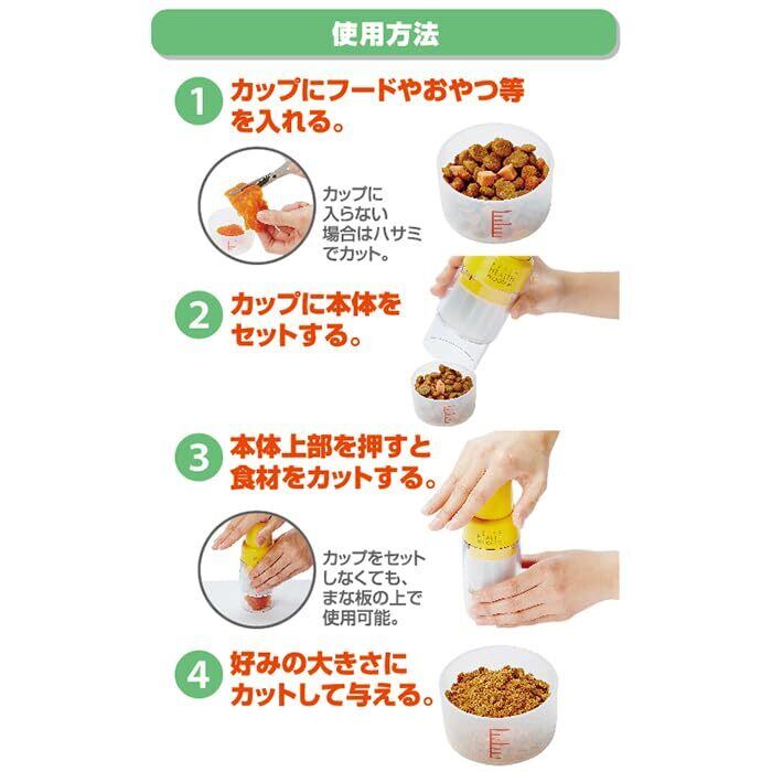 色々なフード・おやつ等を細かくすることで、苦手な食材やシニアや仔犬・仔猫も食べやすいように小さく与えたり、いつもの食事にアクセントとしてふりかけにしたり、手作りごはんにも便利。