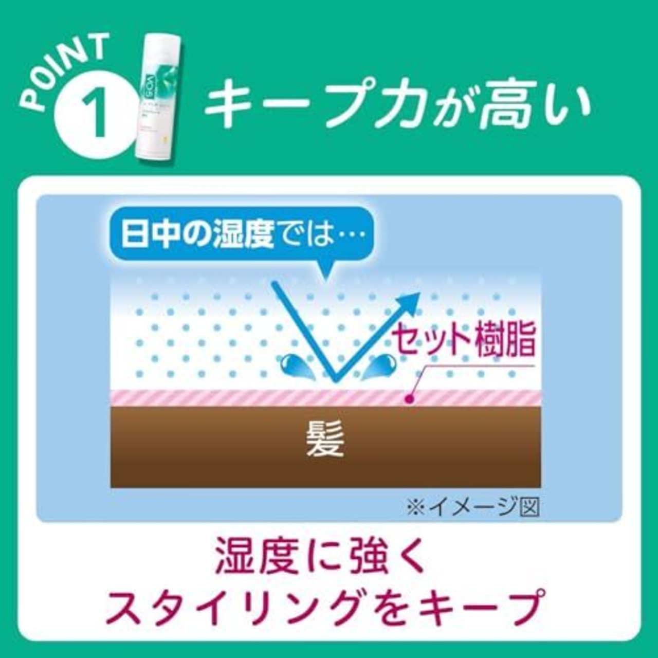 ヘアスタイルをしっかり固めてロングキープ。雨・風の日もくずれません。髪をケアする5種類のVital Oil配合。