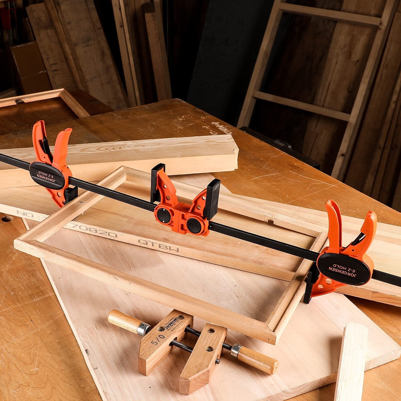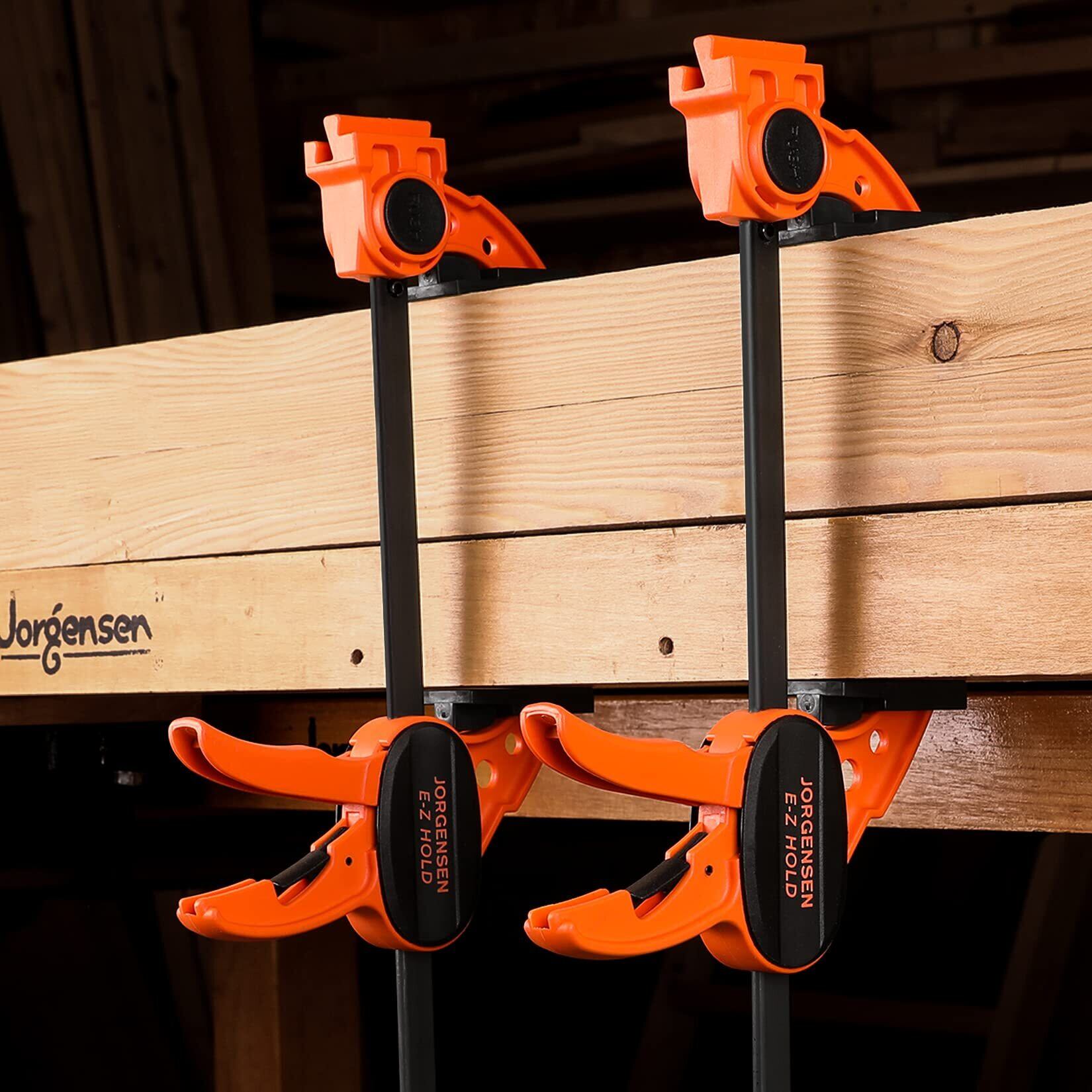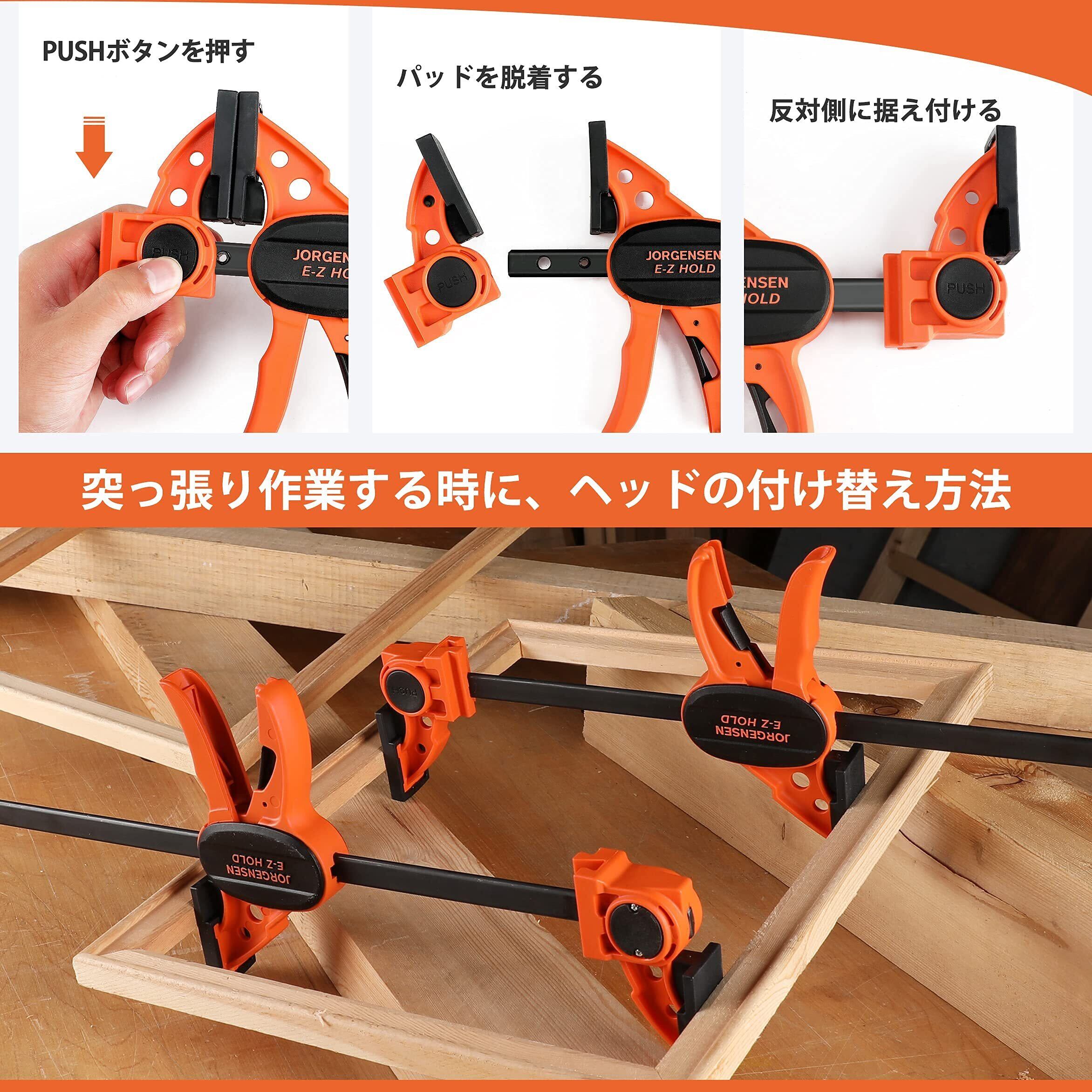 JORGENSEN クランプ Fクランプ クイックバークランプ 300mm 2本組 最大締付力約68kg 1セット3役 クイックリリースレバー 滑り止め 樹脂保護パッド付き 木材 強力固定 接着 溶接 切削 DIY工具 オレンジ、ブラック