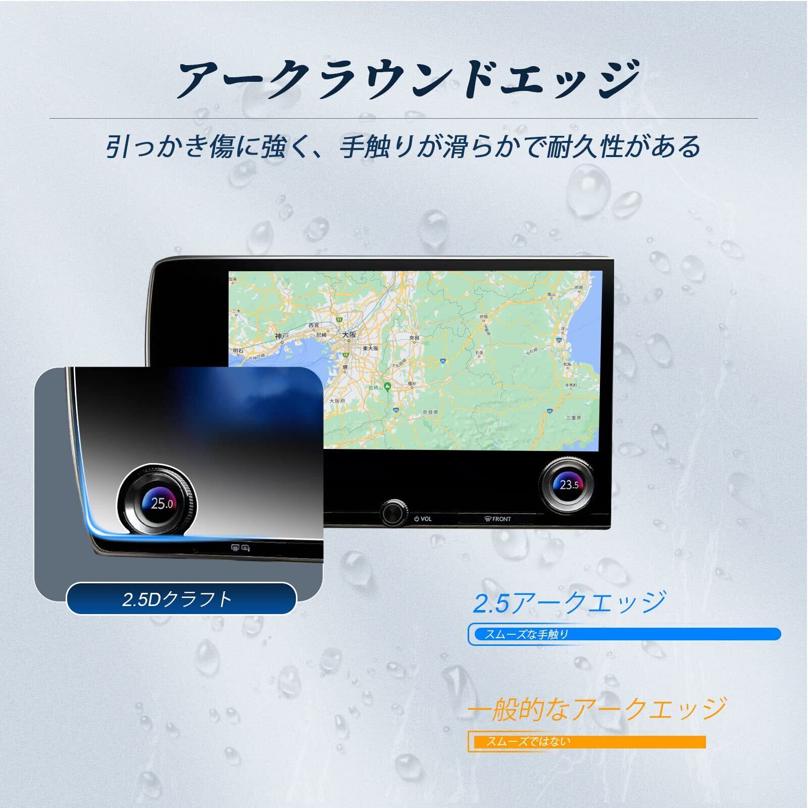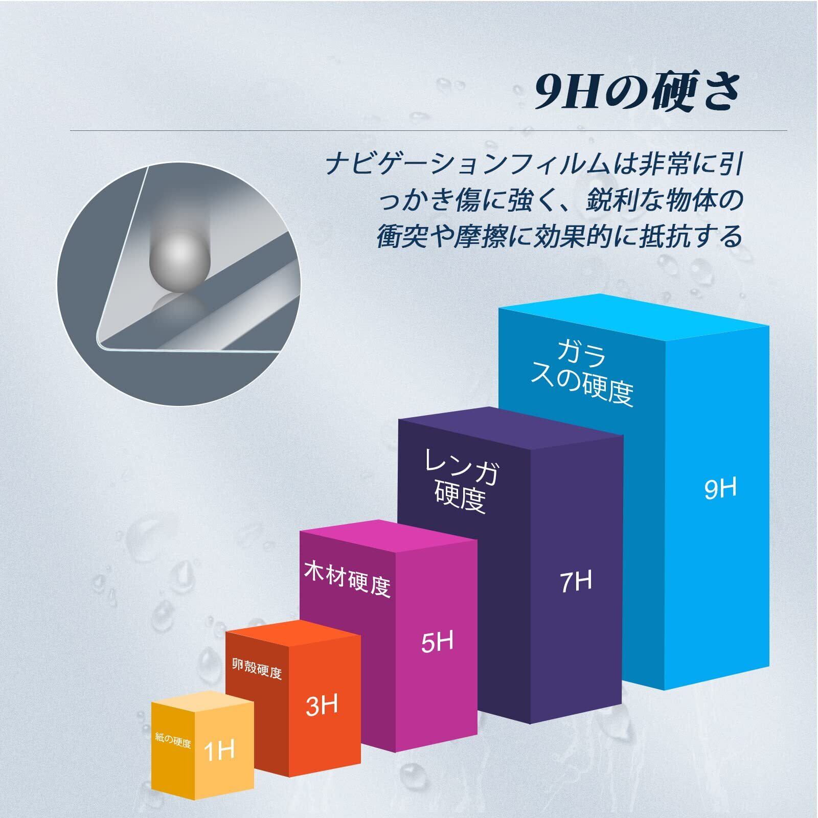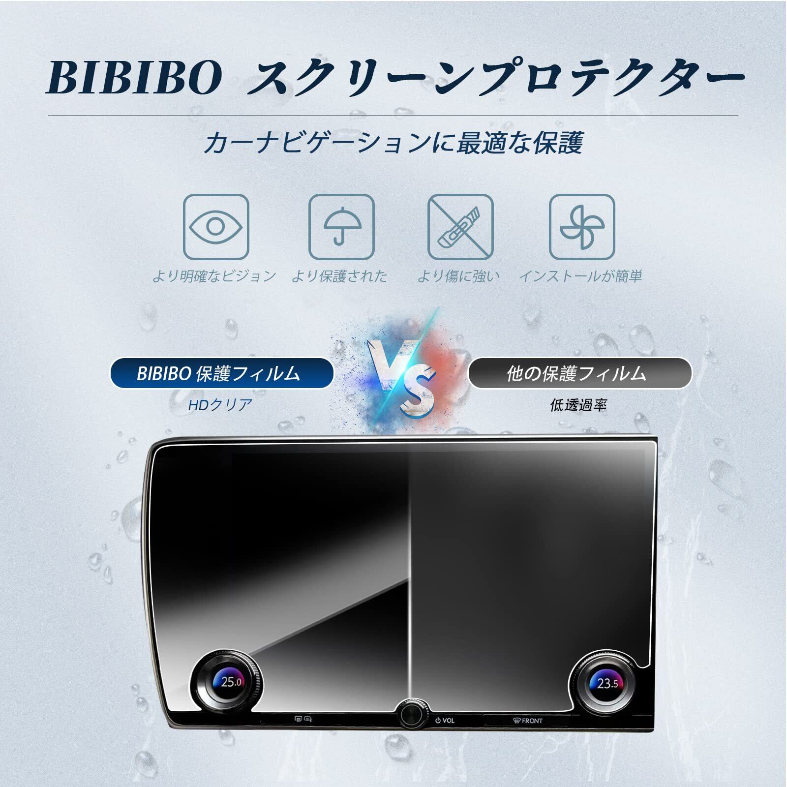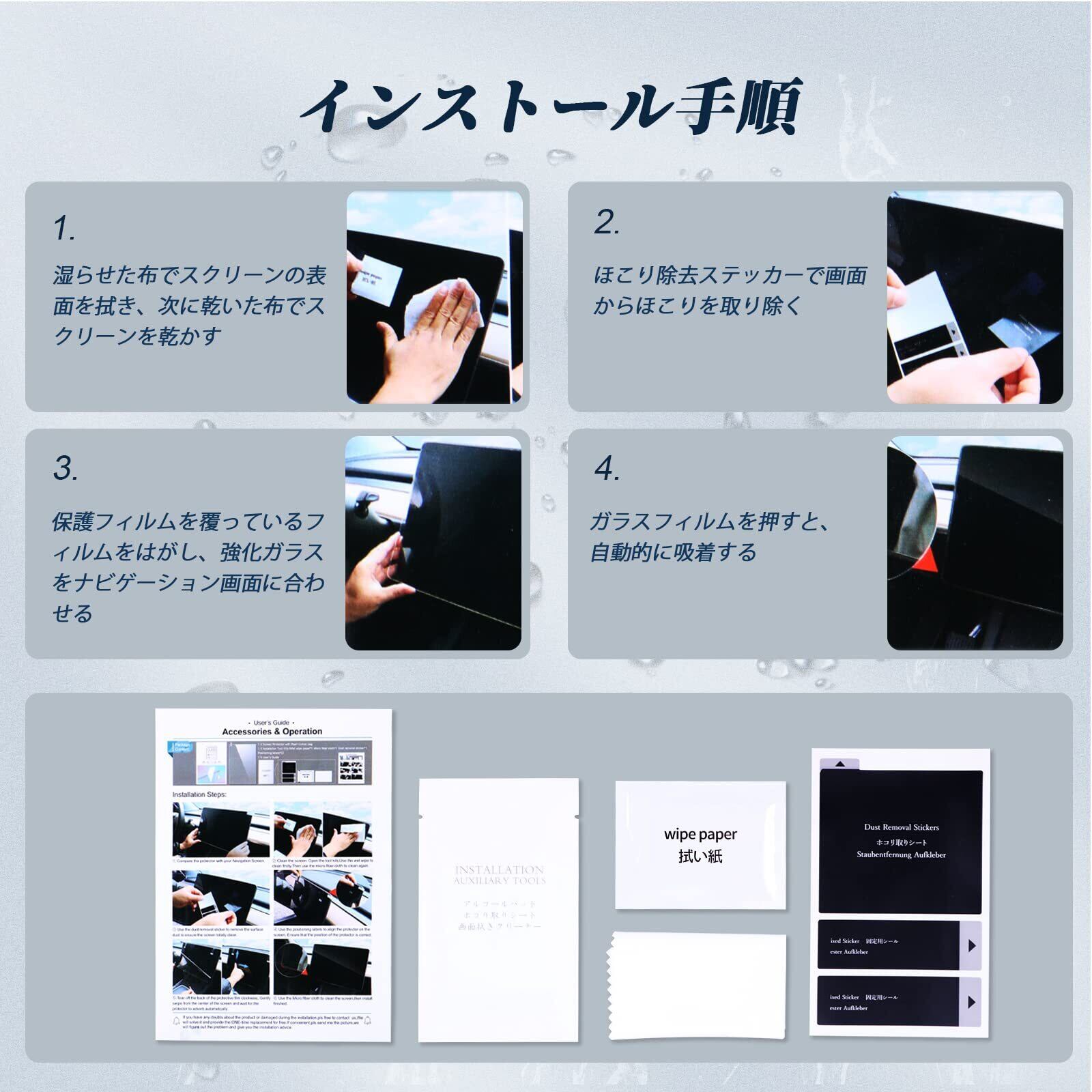 【取り付け】BIBIBOのNX2フィルムは自動的に吸着され、ナビゲーション画面に簡単に取り付けることができる。まず、付属の布でナビゲーション画面をきれいにする。次に、ダスティングペーパーでほこりを取り除きる。 最後に、この製品の保護紙をはがした後、スクリーンに合わせてカバーすると、自動的に吸着される。