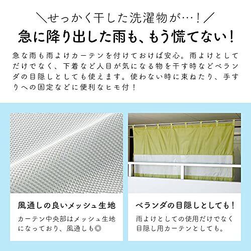【急に降り出した雨も、もう慌てない】せっかく干した洗濯物が…! 急な雨も雨よけカーテンを付けておけば安心。雨よけとしてだけでなく、下着など人目が気になる物を干す時などベランダの目隠しとしても使えます。使わない時に束ねたり、手すりへの固定などに便利なヒモ付!