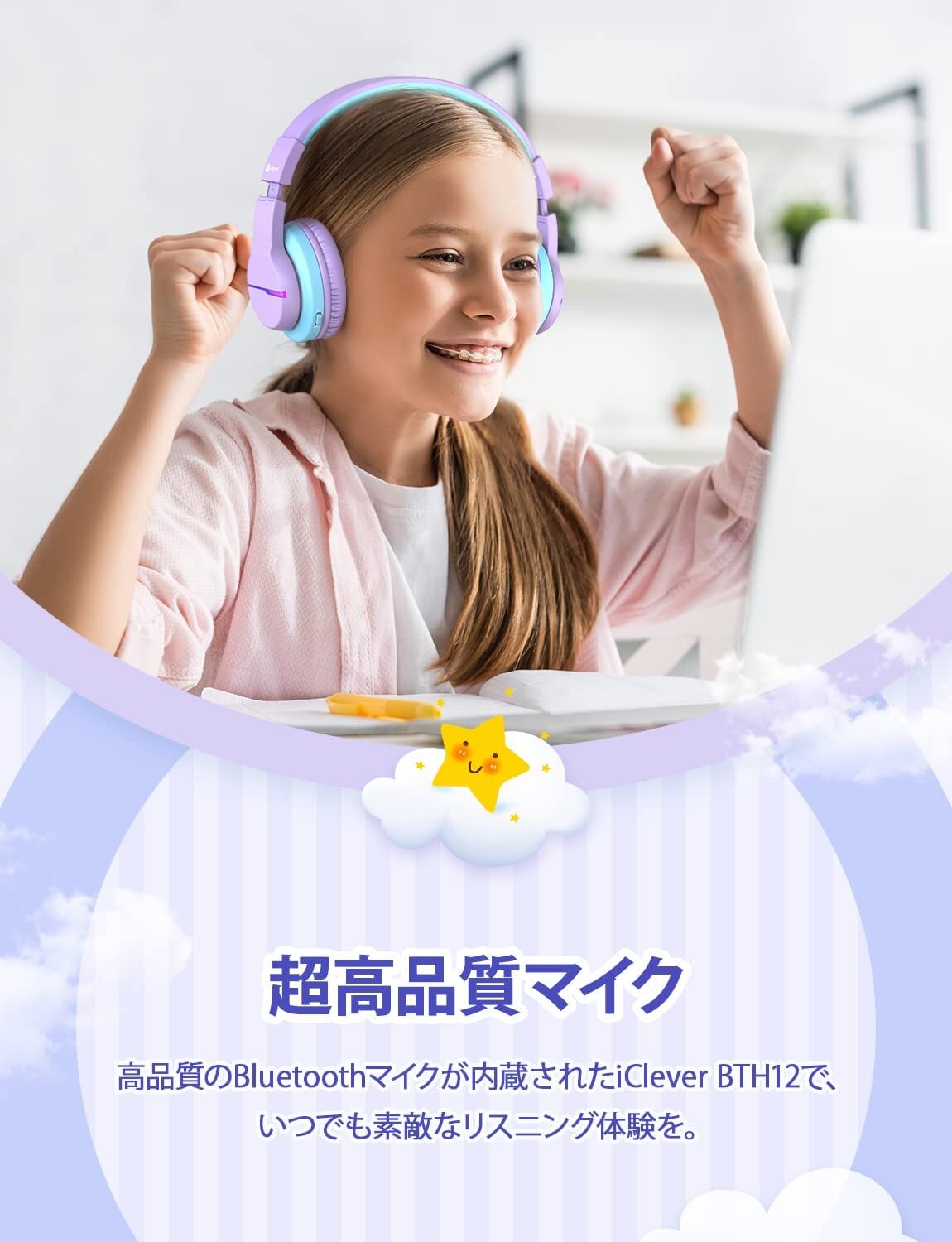 iClever 子供用ヘッドフォン Bluetoothヘッドフォン ワイヤレス キッズヘッドフォン 音量制限付き(74/85 dBA) 55Hプレイタイム マイク付き 学校/タブレット/PC用 (パープル)