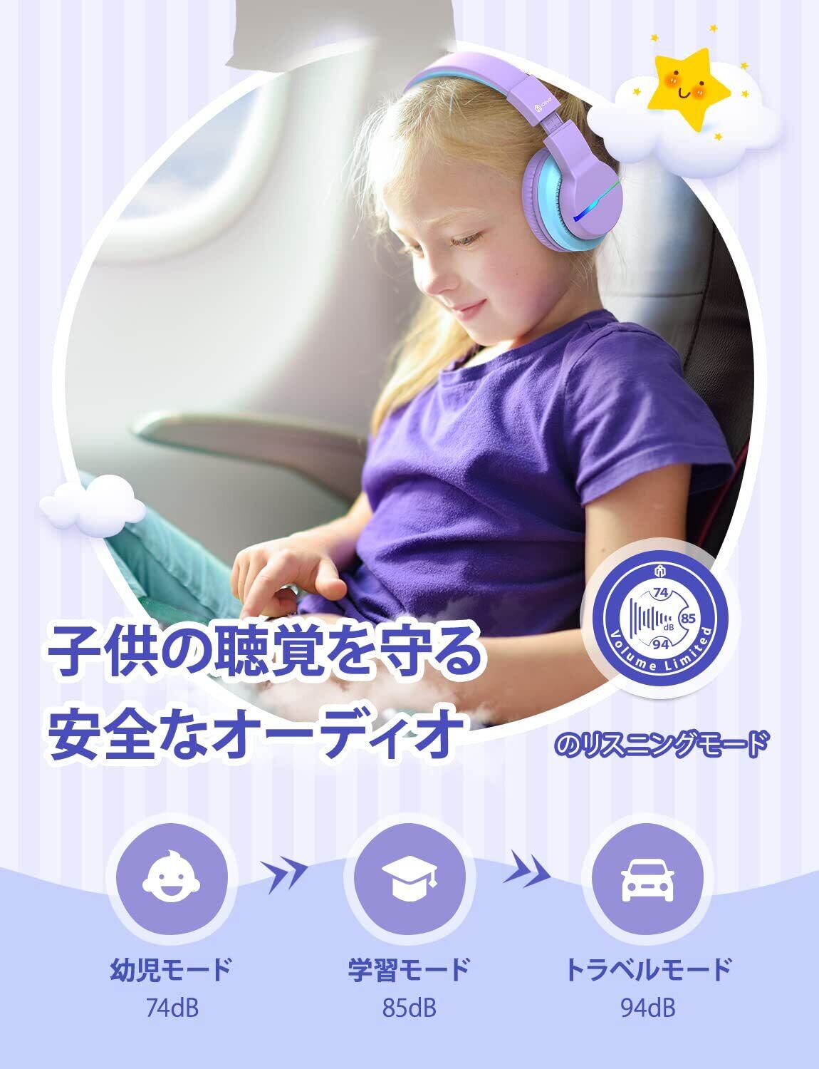 [ステレオサウンドと74/85dBAの音量制限]:豊かな低音とリアルなオーディオを提供する40mmスピーカーユニットを内蔵しています。接続可能距離は半径10メートル以内です。最大音量を85dBAに設定しており、機器の誤操作による大音量からお子様の耳を守る、お子様に優しいヘッドホンです。▲2025年2月~現在販売中のモデルは、WHOの更新に伴い、音量制限機能を「2段階(74/85dB)」に変更しています。