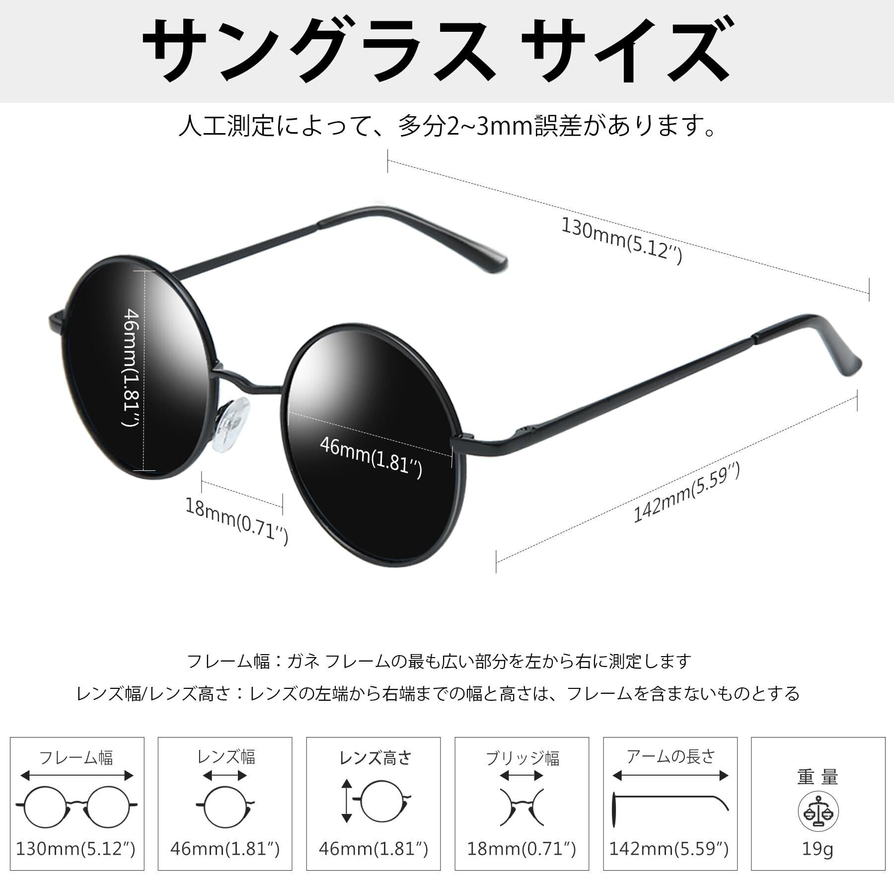 商品仕様: レンズ幅:46 mm(レンズの左端から右端までの幅は、フレームを含まないものとする ) レンズ高さ:46 mm(レンズの上端から下端までの高さは、フレームを含まないものとする) 全体のよこ幅:130mm(メガネ フレームの最も広い部分を左から右に测定します)ブリッジ幅:18 mm;アームの長さ:142 mm;重量:約19g;ご注意:人工測定によって、多分2~3mm誤差があります