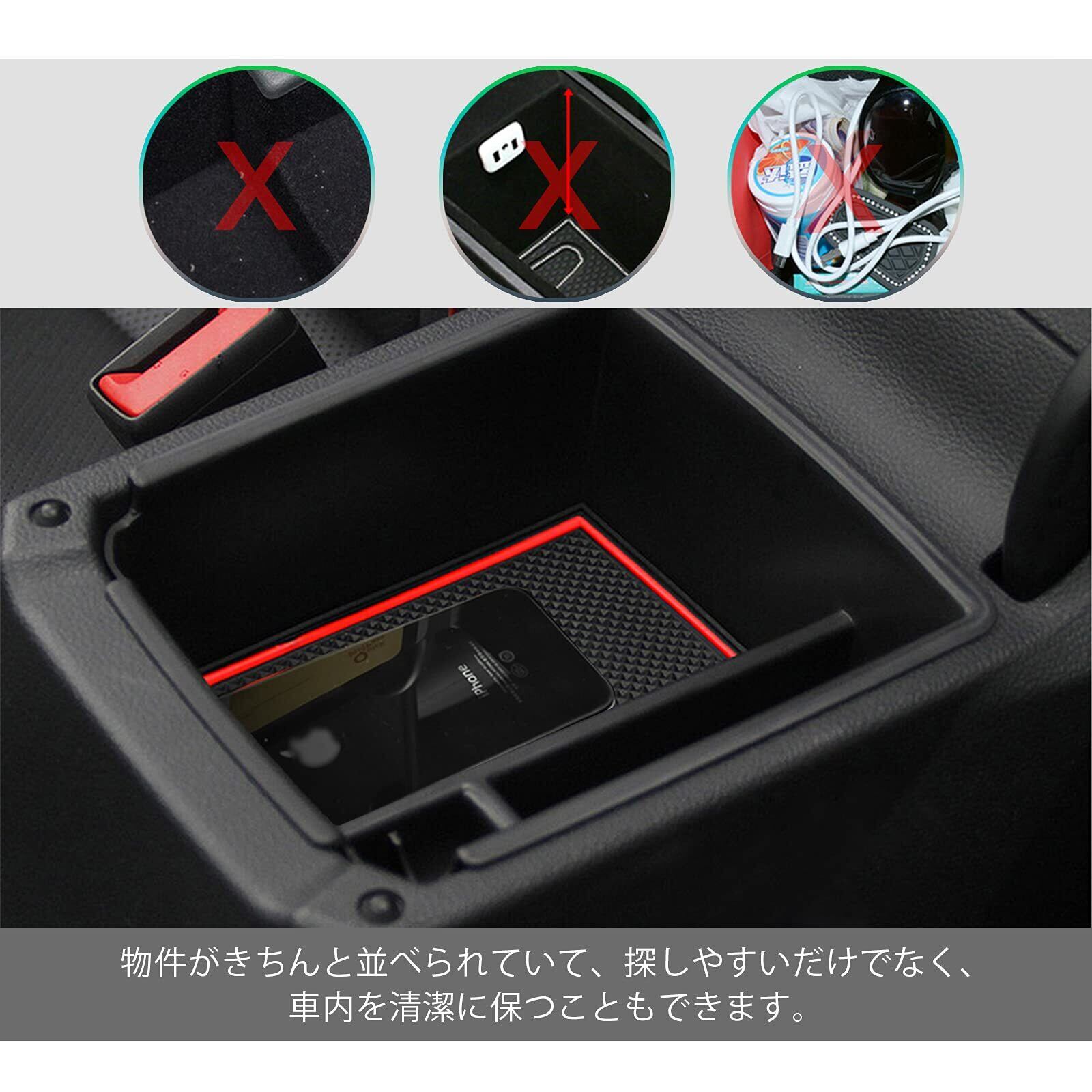 【科学収納】収納ボックスは合理的な科学的な設計によって、分割式の設計を運用して、いくつかのエリアに分けられていて、さまざまなものの収納ができます。収納ボックスにはコインの収納スペースがあり、日常の小銭の保管と使用が便利です。車内のモノの収納が整然として秩序正しくなります。物の探しにも便利で、車内の清潔さを保つことができ、快適な使用体験をもたらします。また、収納ボックスには充電ケーブル用の穴を設け、収納と充電の両方を使えています。