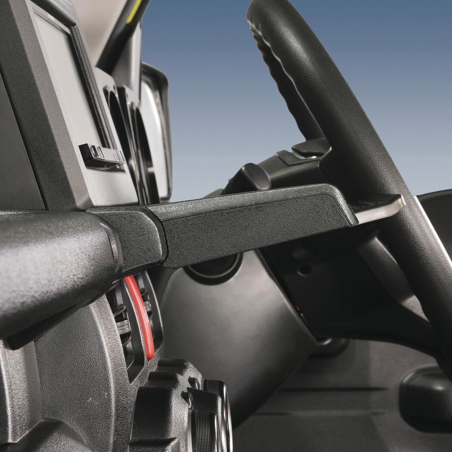 【運転操作・エアコン風を妨げない】運転操作の邪魔にならないよう、トレーを助手席寄りにオフセット。エアコン吹き出し口も遮らない設計です。